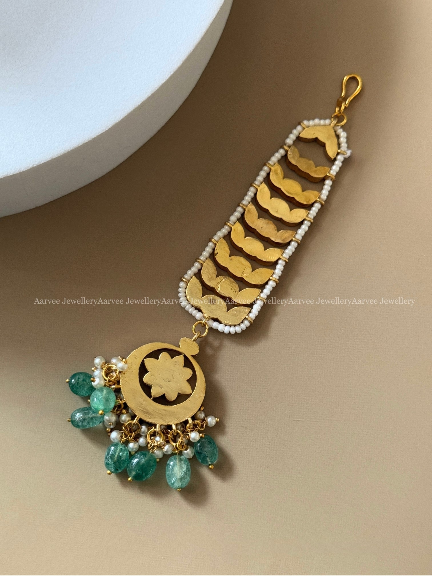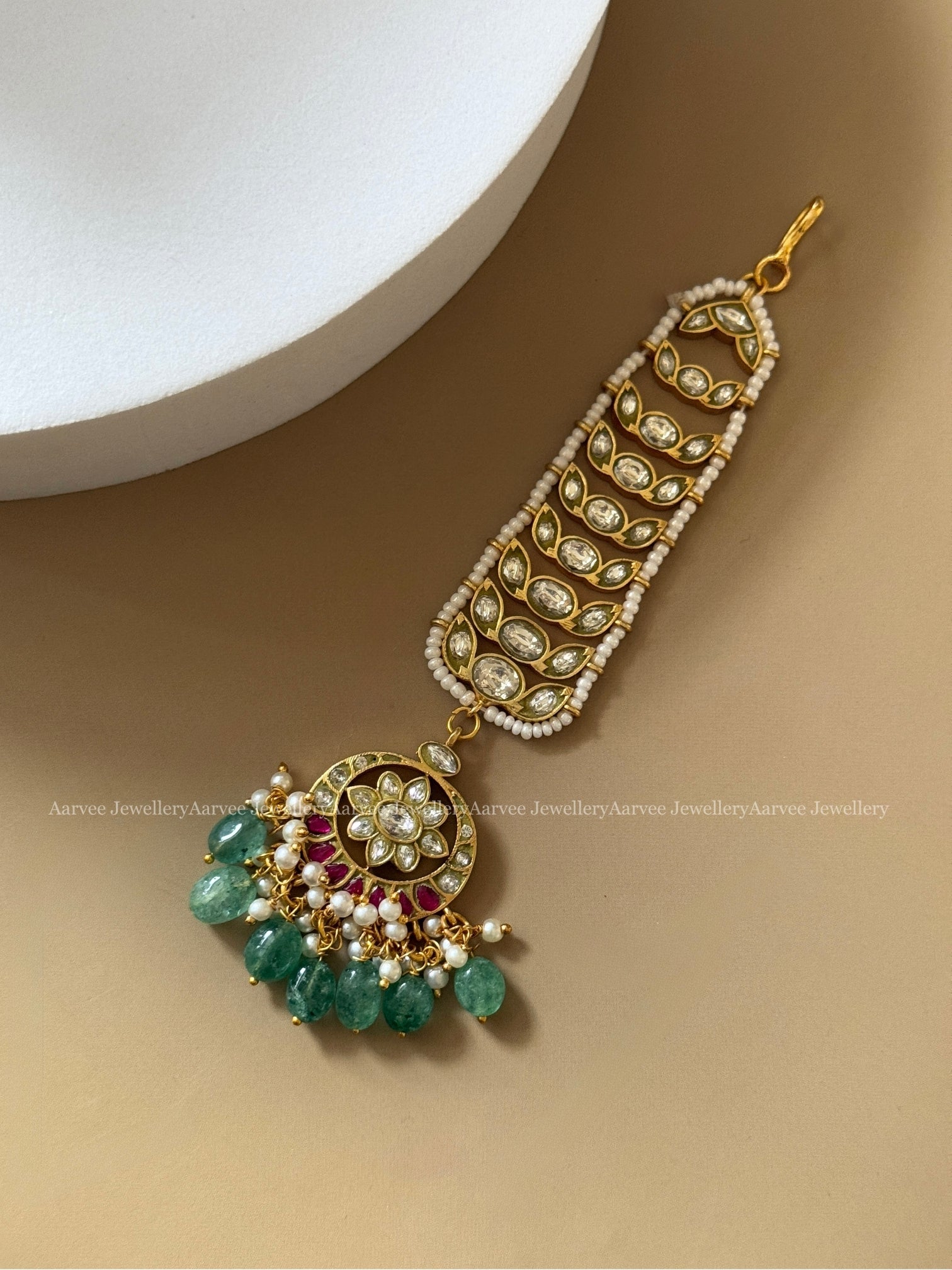 Traditional Jadau Kundan Headpiece with White Stones and Soft Pastel Accents
