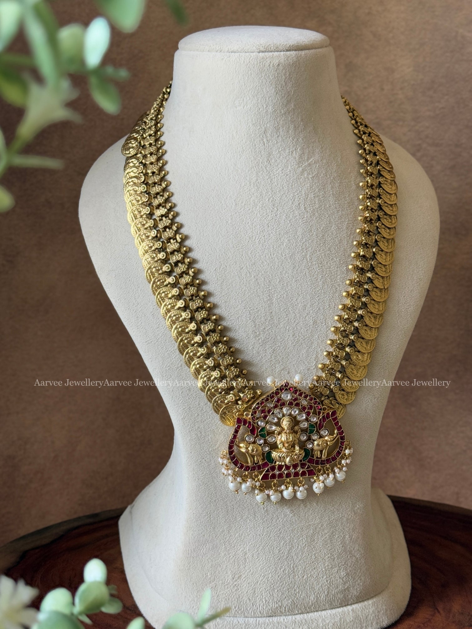 A traditional necklace features a radiant Lakshmi pendant suspended from a gold coin chain, highlighted by Jadau Kundan artistry and pearl bead accents