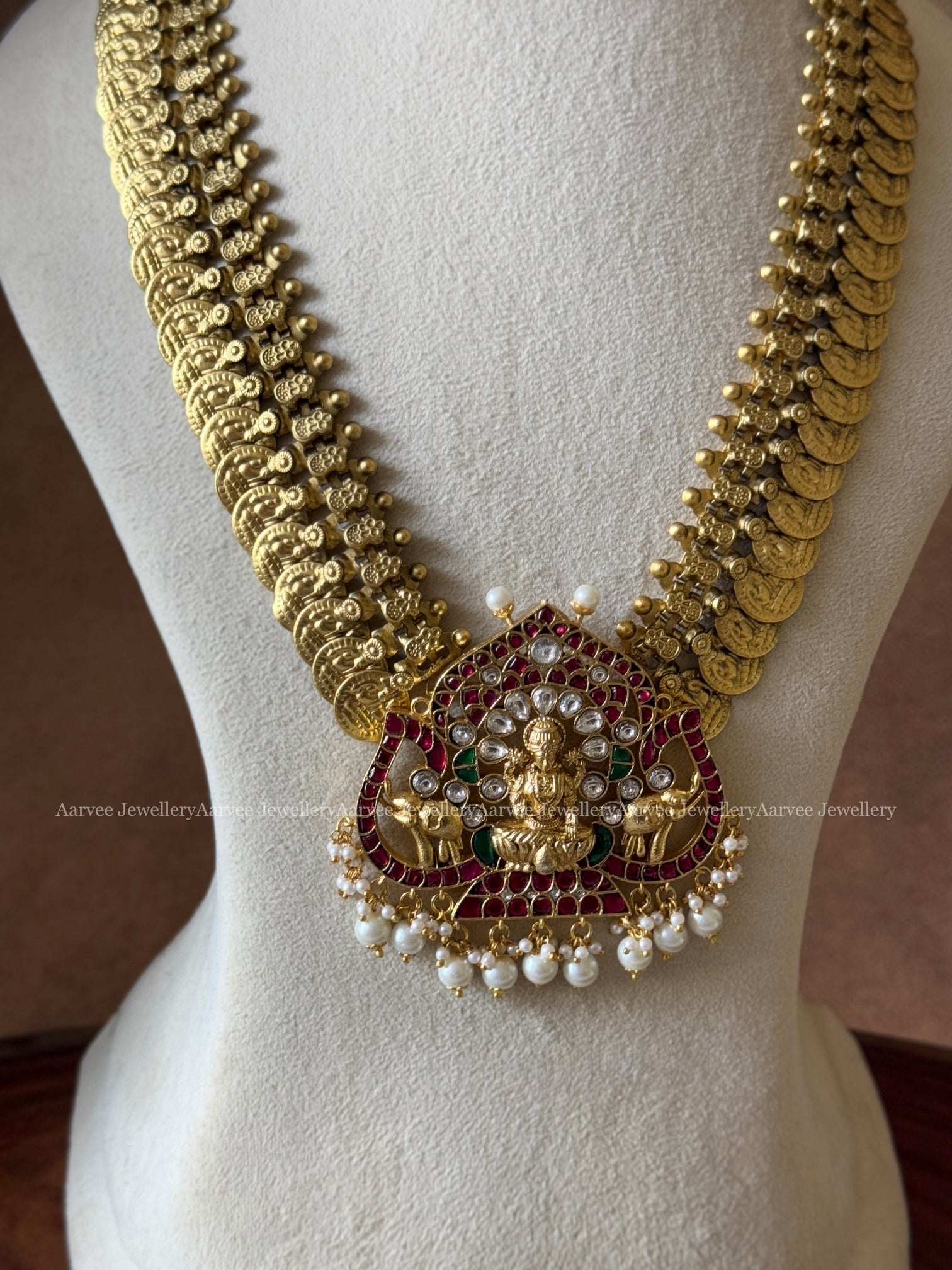 JADAU KUNDAN MID LENGTH GOLD COIN CHAIN WITH LAKSHMI PENDANT WITH PEARL BEADS