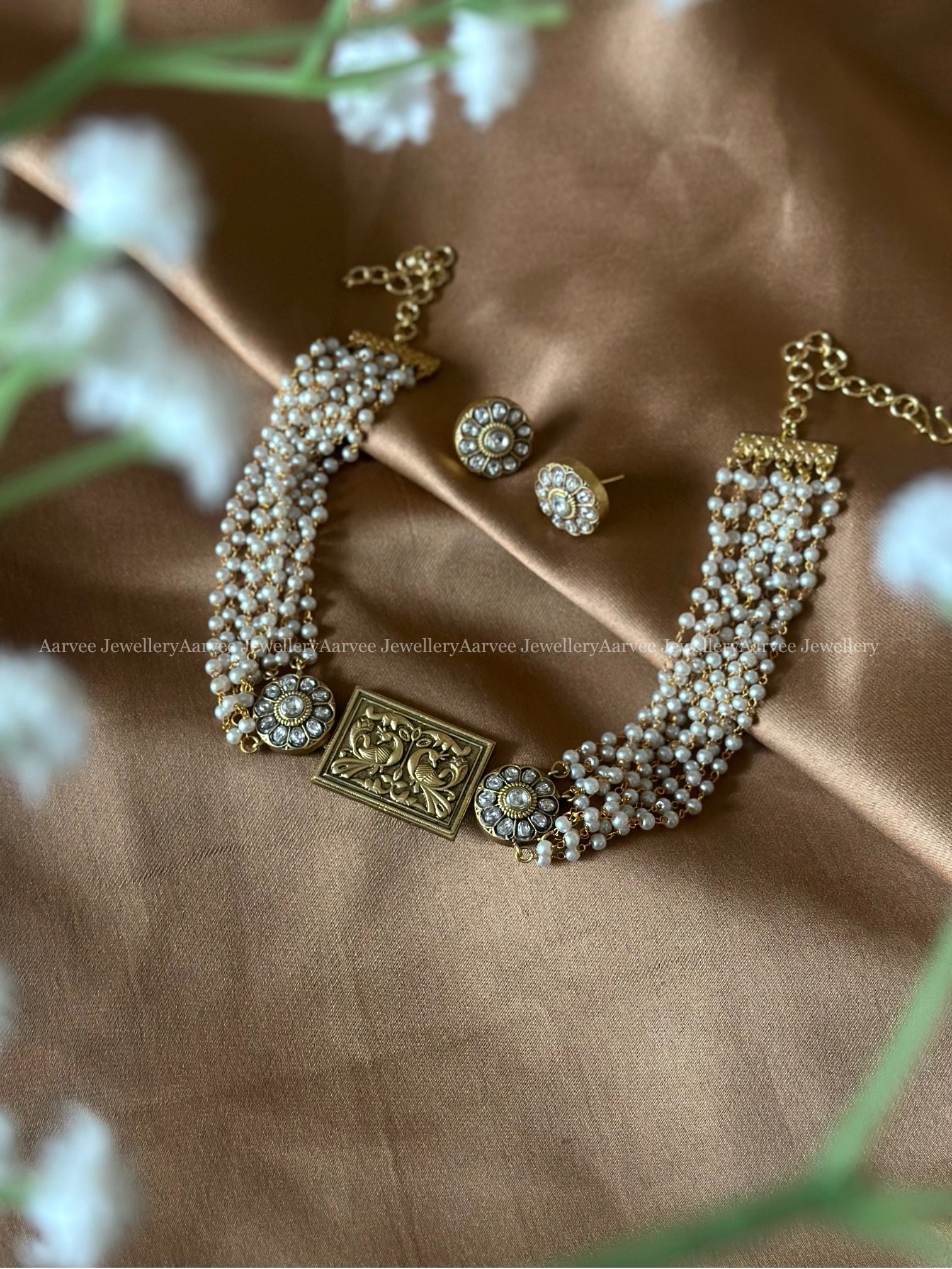 JADAU KUNDAN MULTI LAYER PEARL BUNCH CHOKER WITH PEACOCK EMBOSSED PENDANT