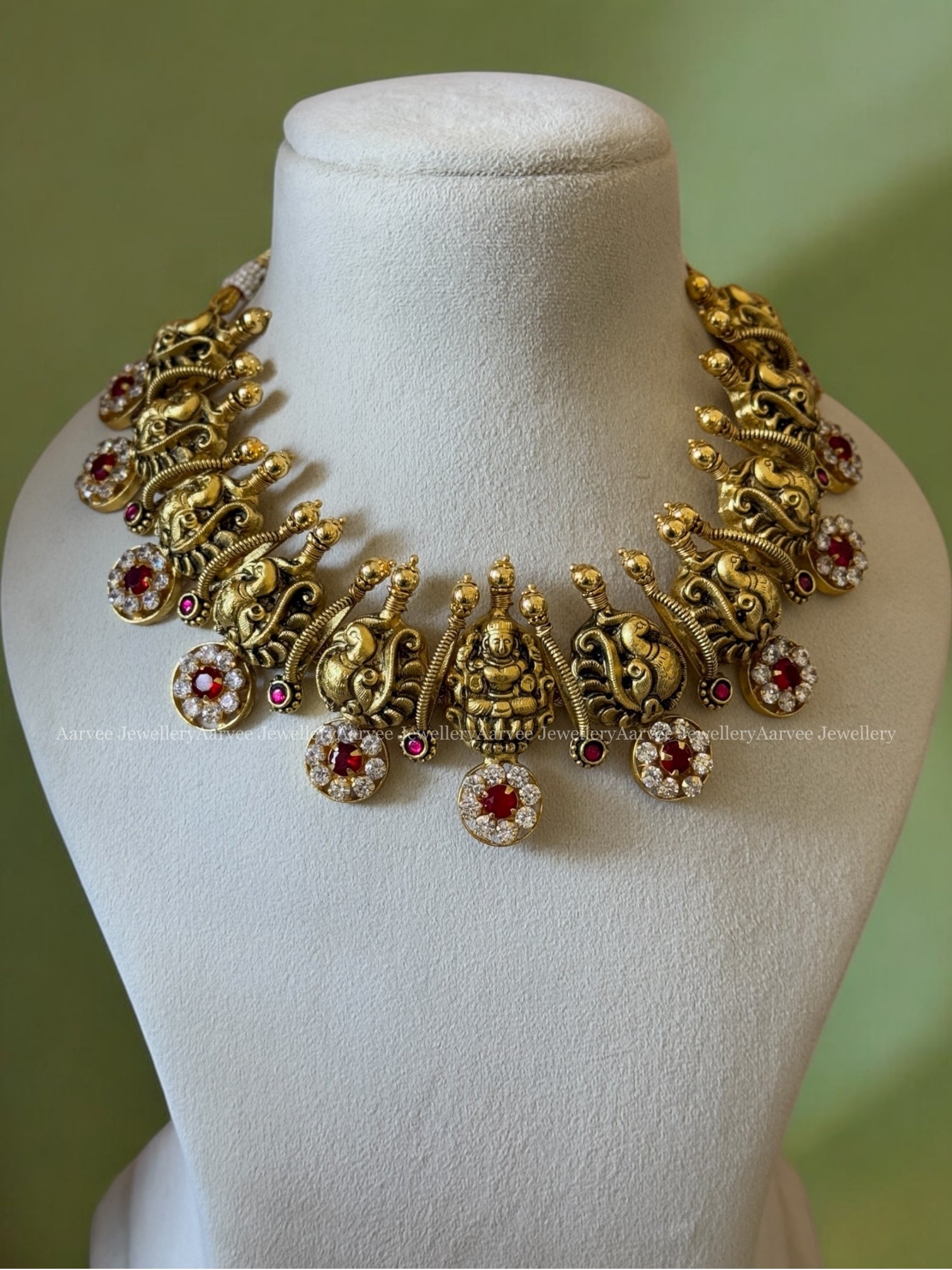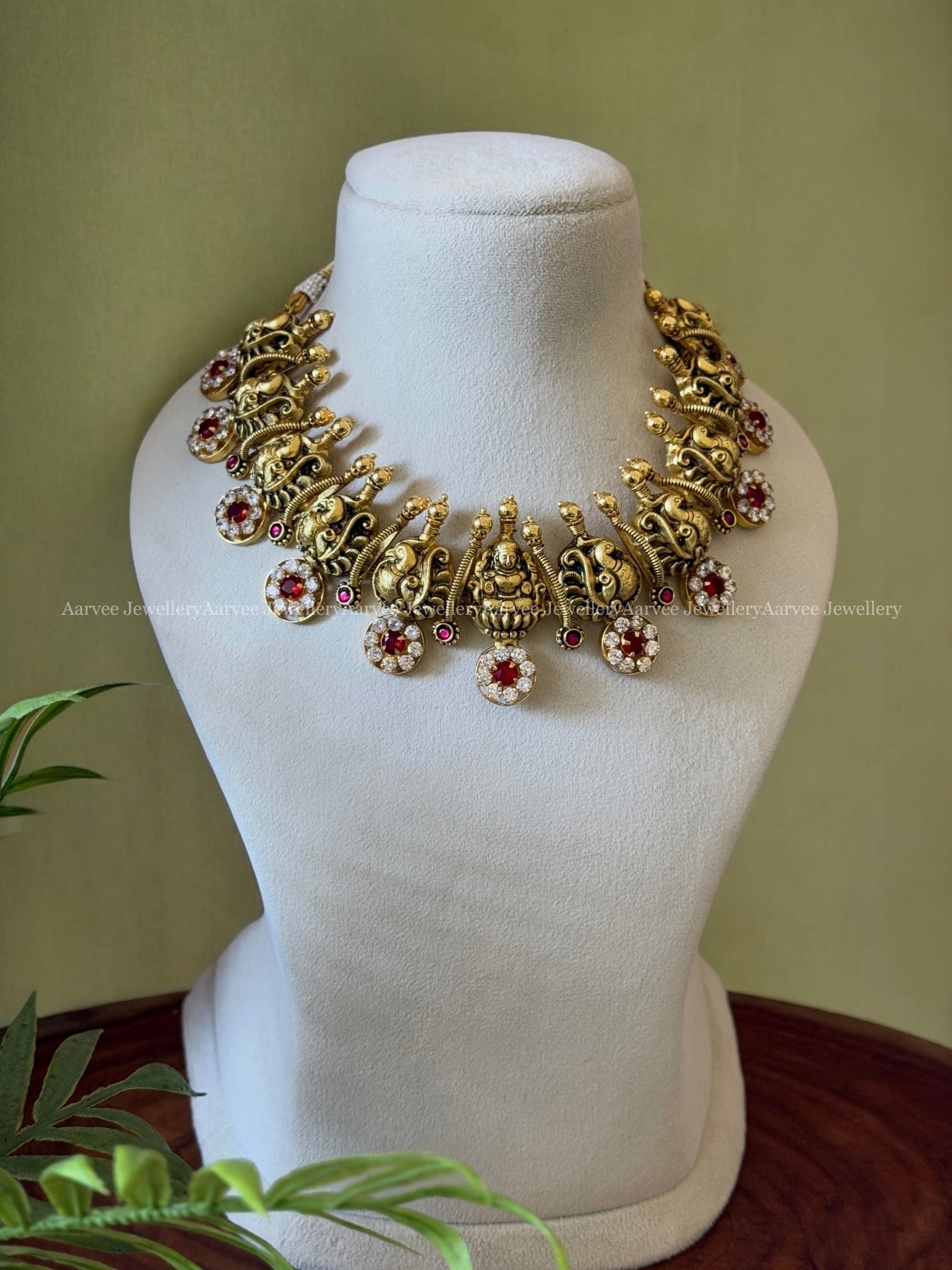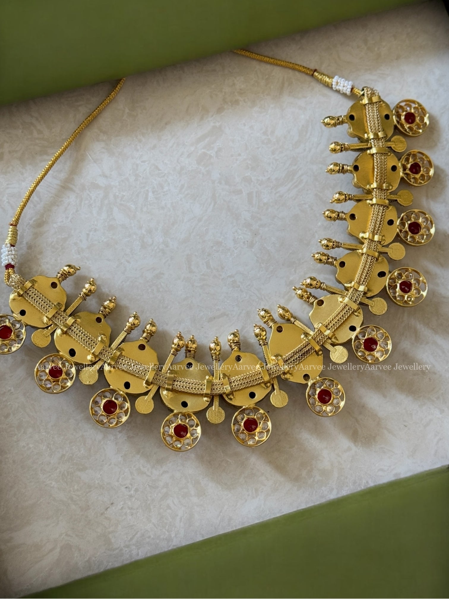 Traditional Jadau Kundan necklace with Nagas design, crafted using a harmonious mix of ruby and white stones