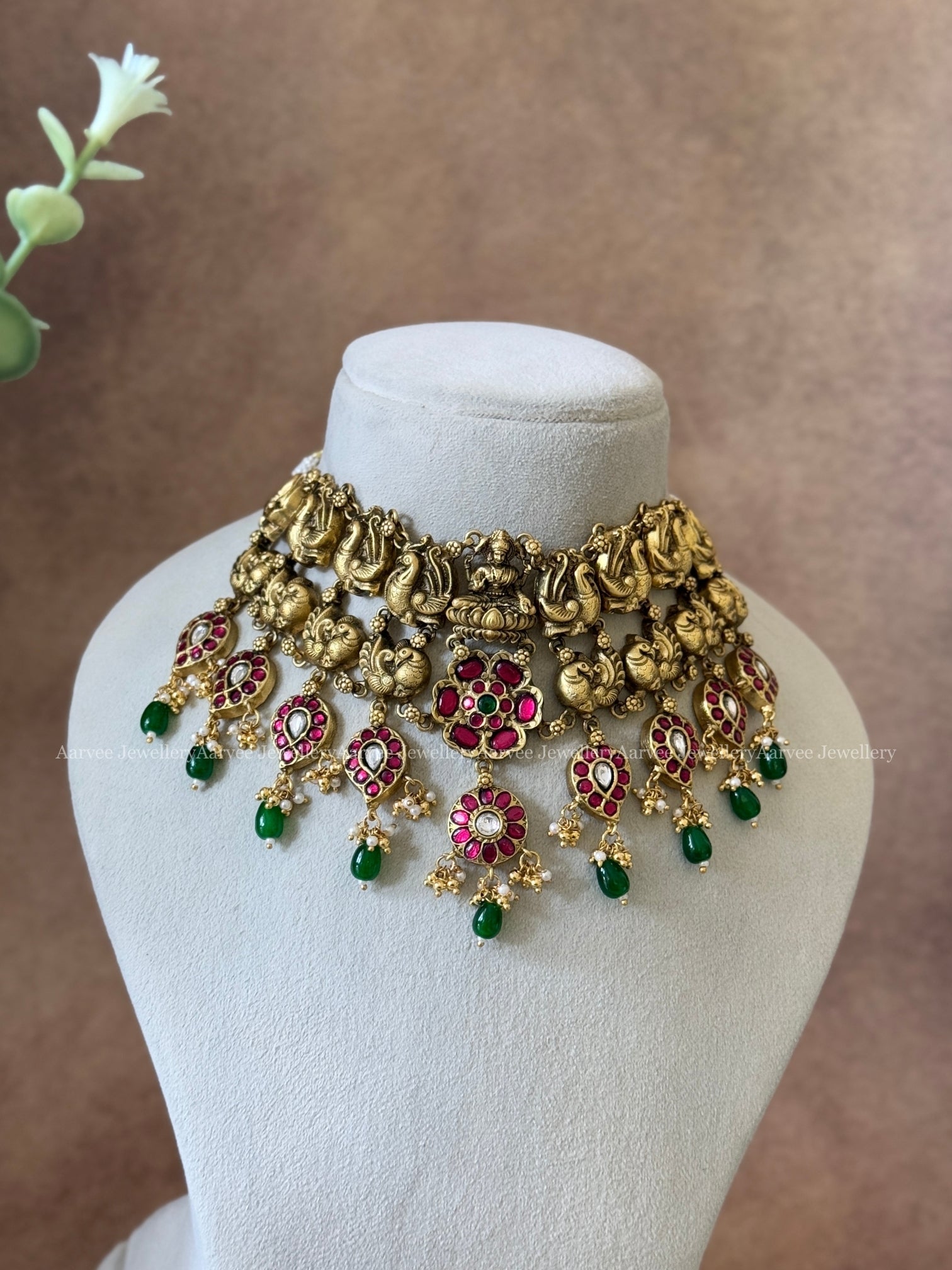Elevate your traditional look with this handcrafted Jadau Kundan Choker, featuring symbolic Peacock and Lakshmi elements, ruby detailing, and delicate green beads. Finished in antique gold and paired with matching earrings, it exudes elegance perfect for weddings and festive occasions.