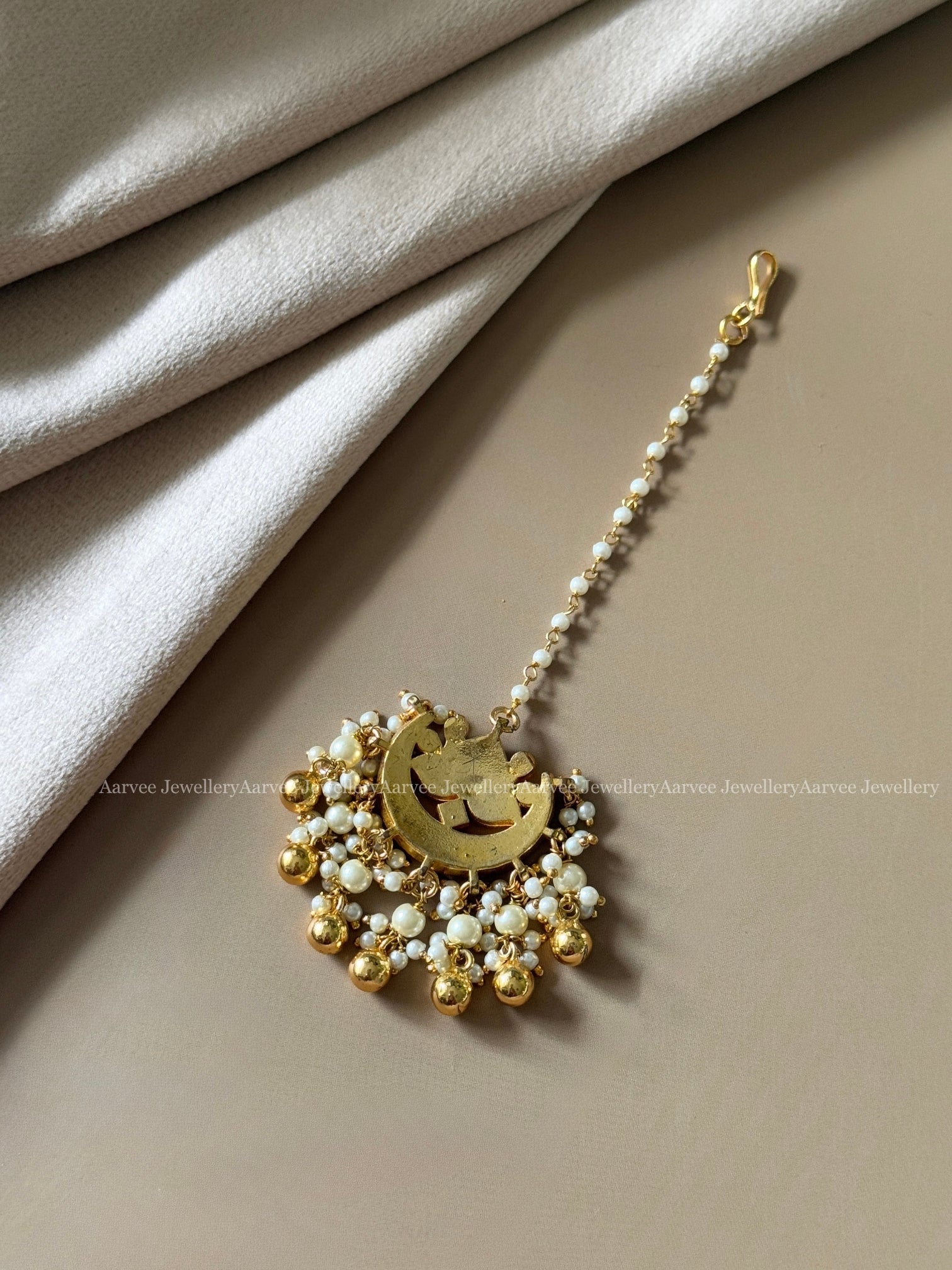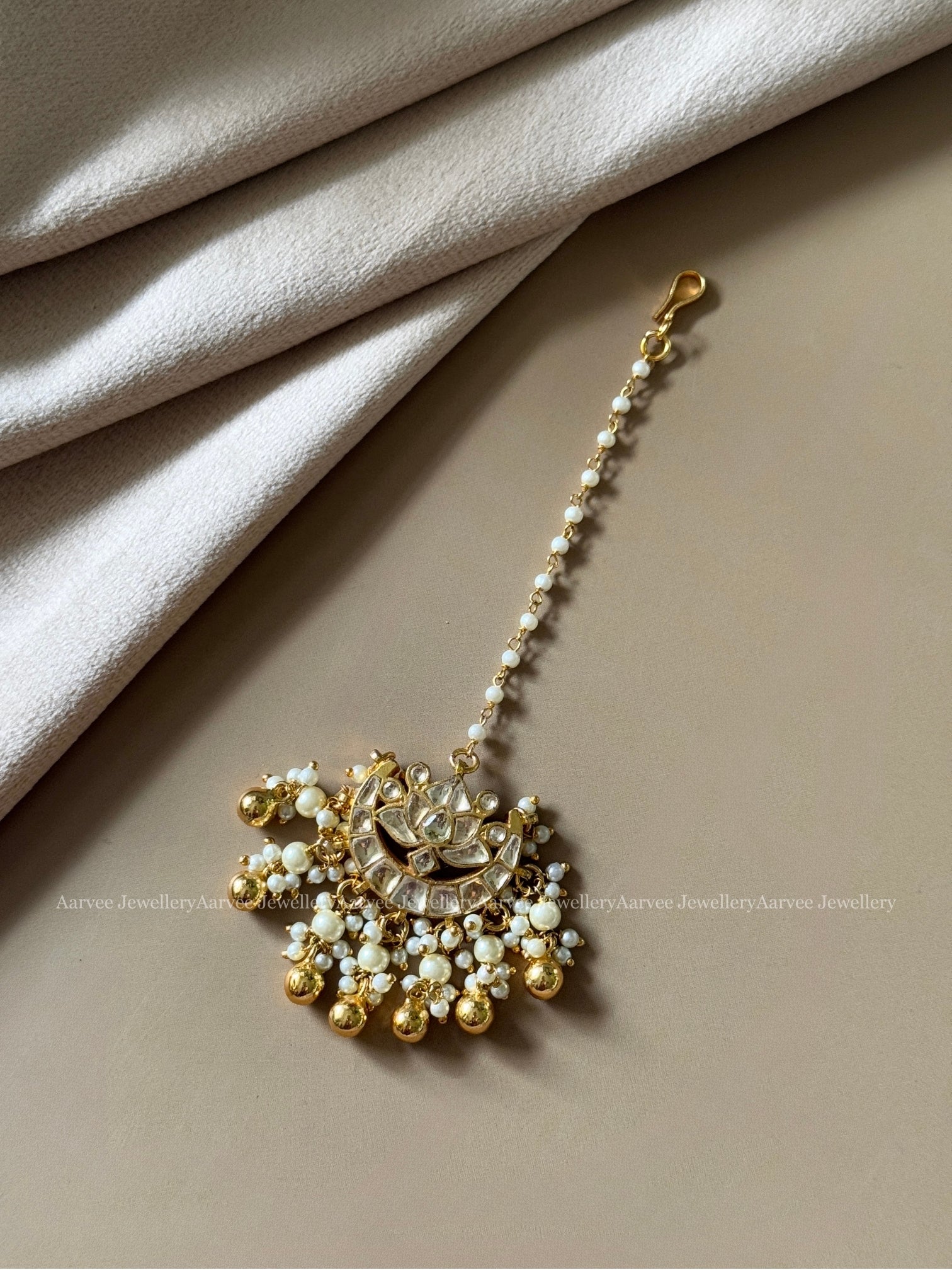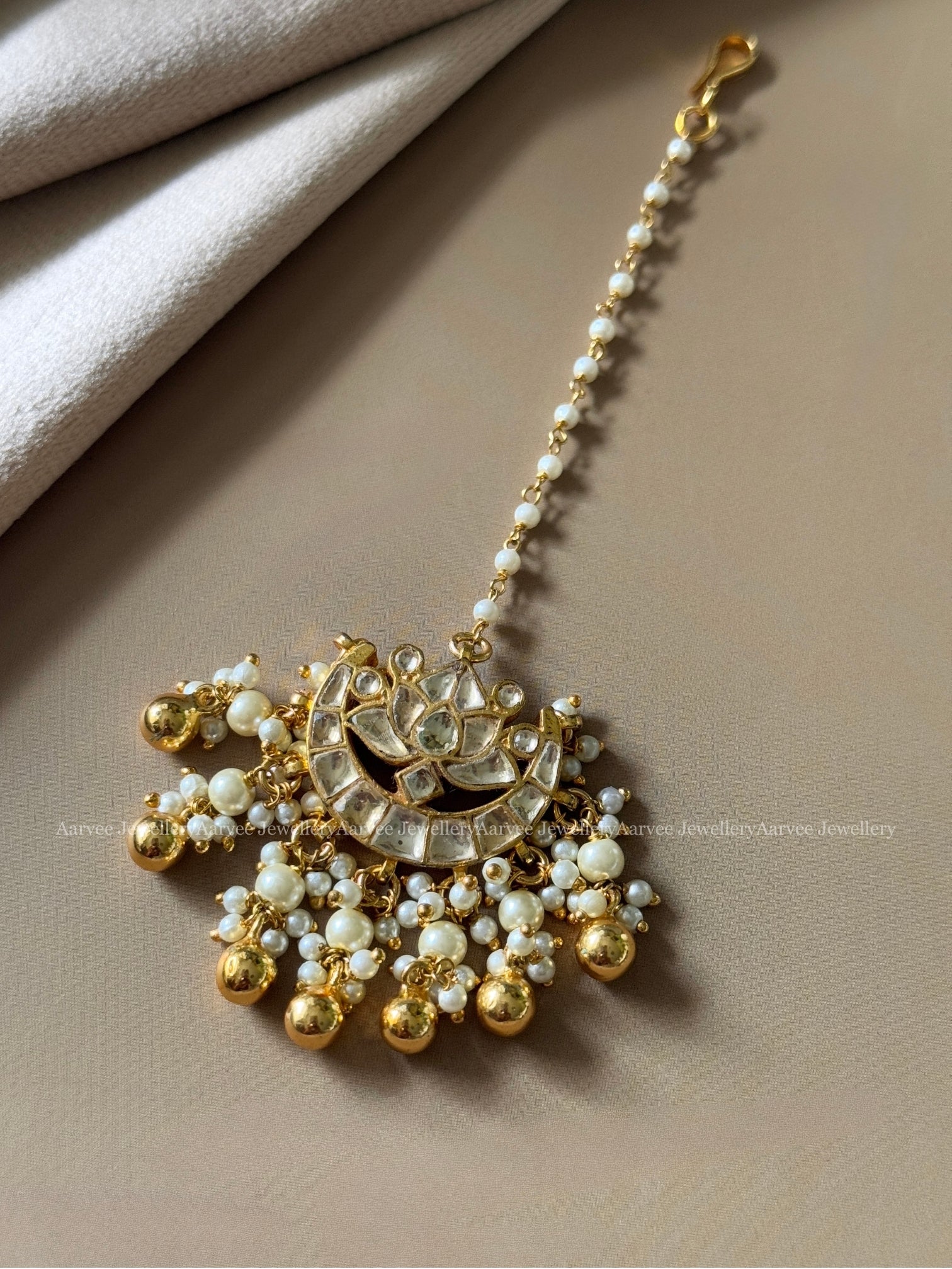 JADAU KUNDAN PEARL BEAD TIKKA WITH WHITE STONE LOTUS PENDANT