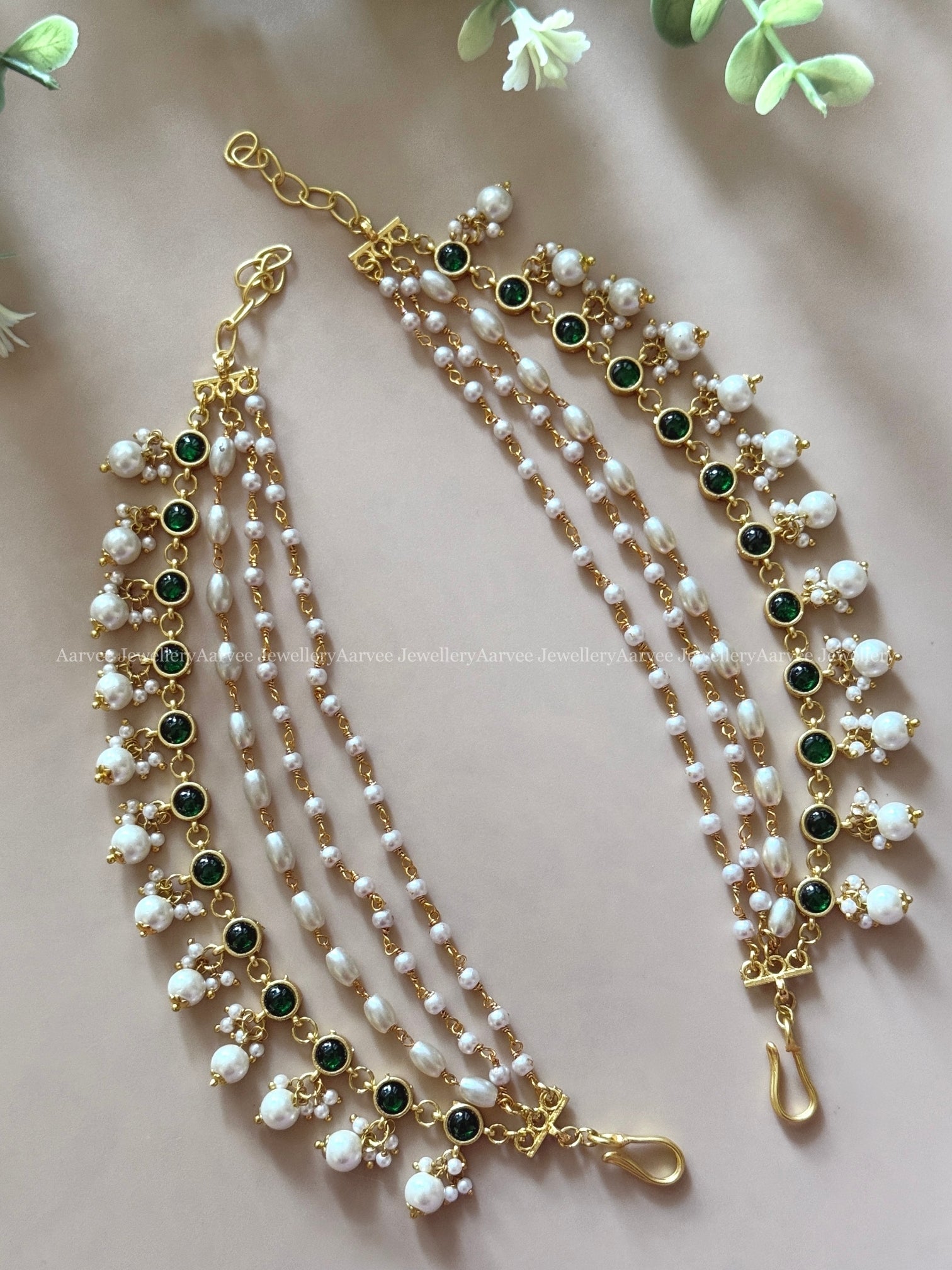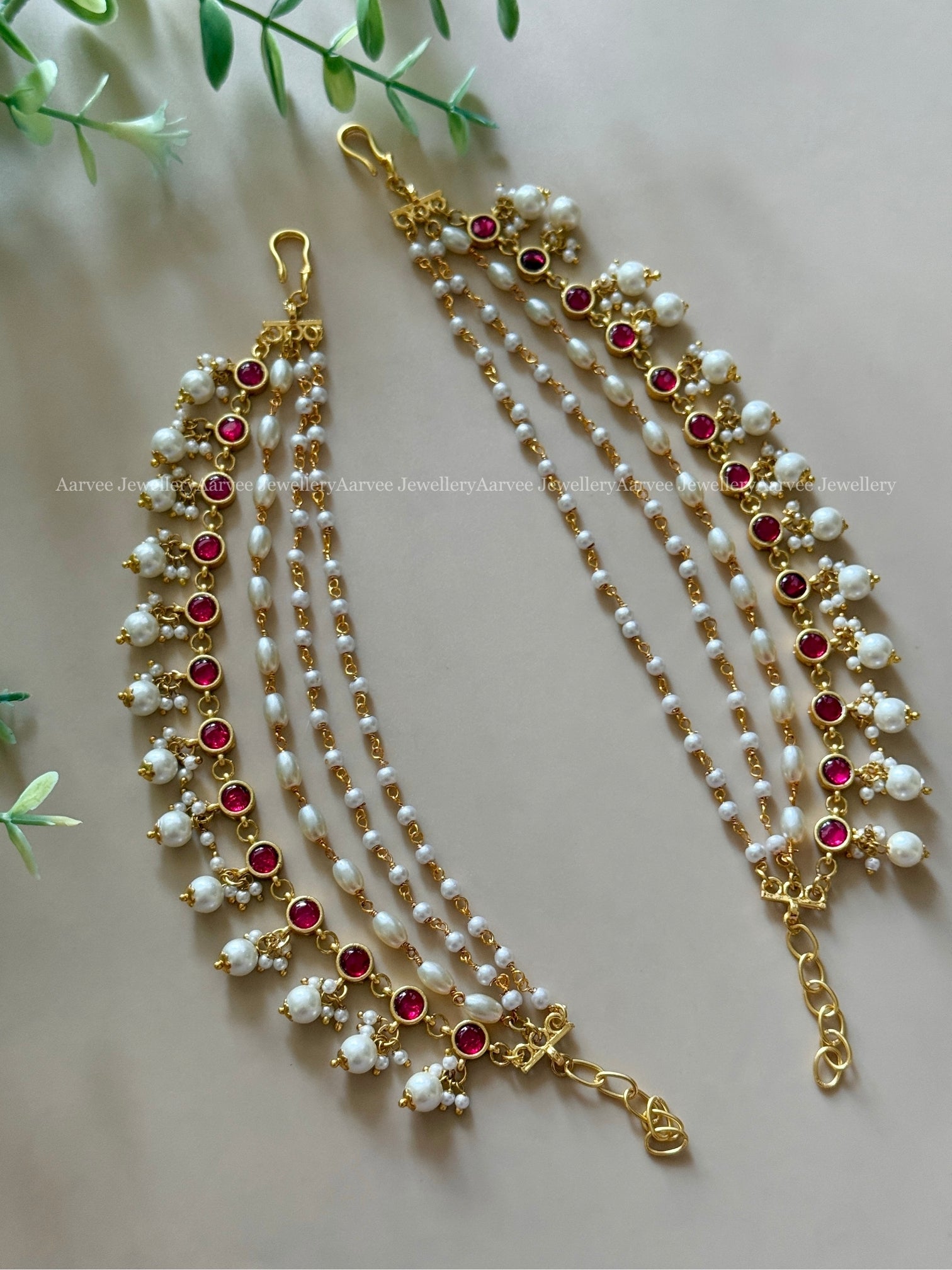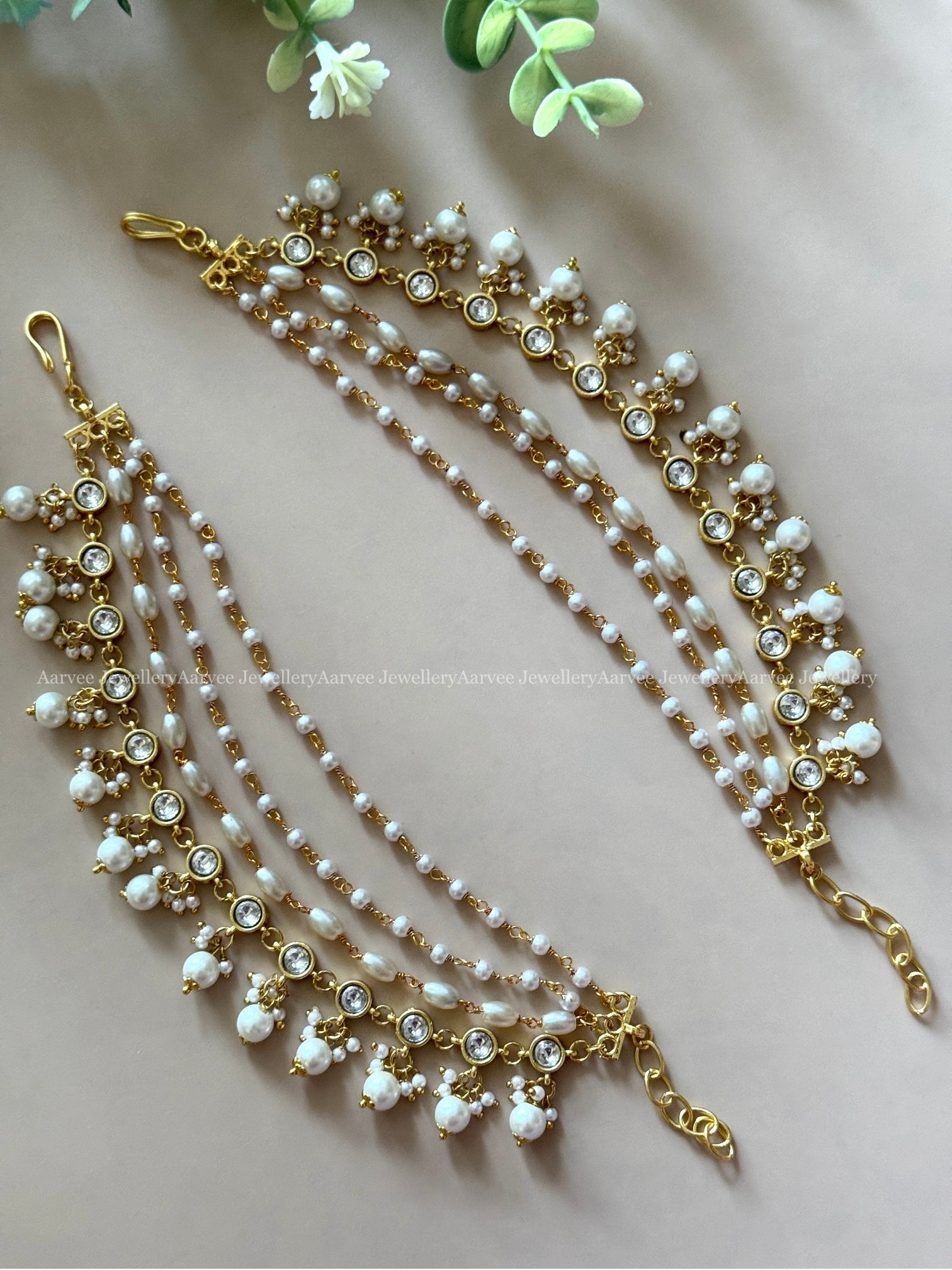 Adorn your ears with this classic layered ear chain, combining the richness of Jadau Kundan craftsmanship with soft, flowing pearl strands