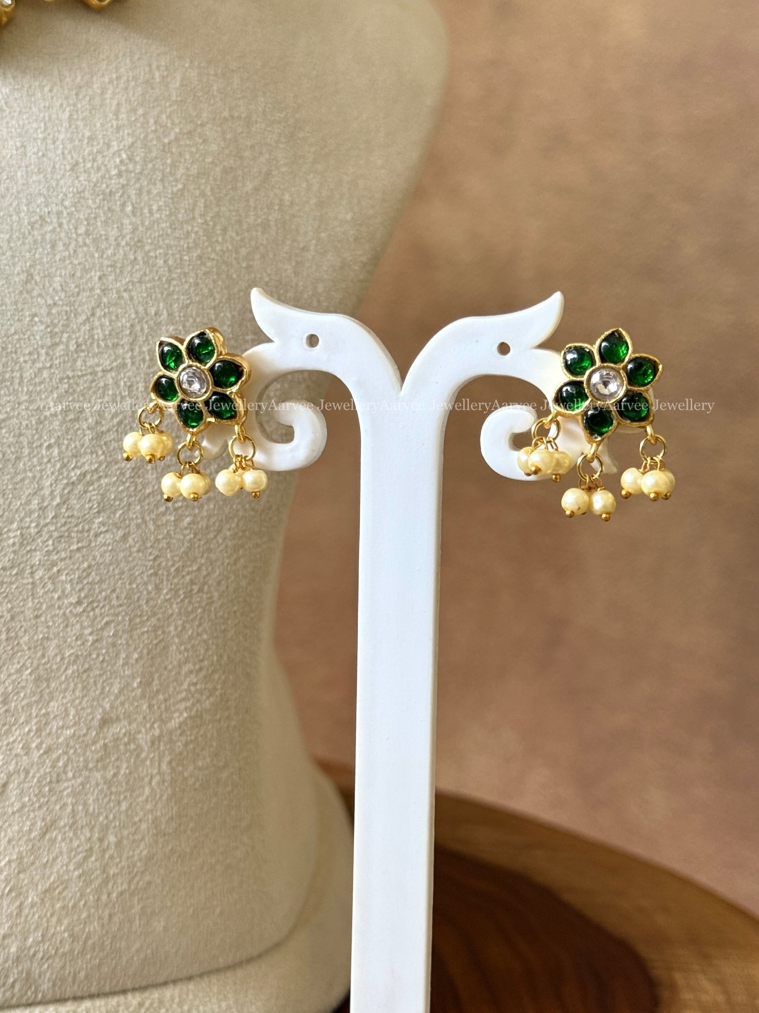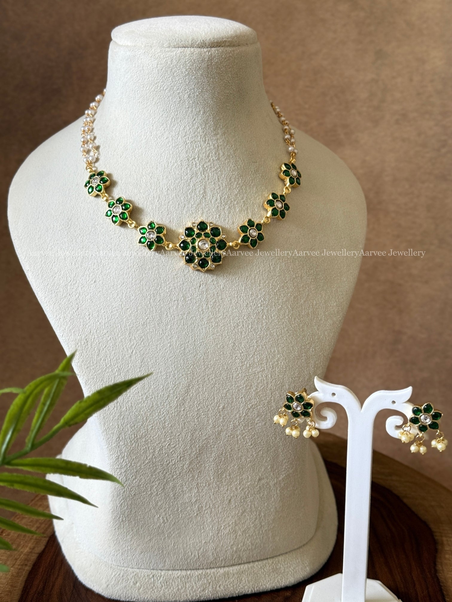 JADAU KUNDAN PEARL LINE NECKLACE SET WITH GREEN STONES FLORAL PENDANT