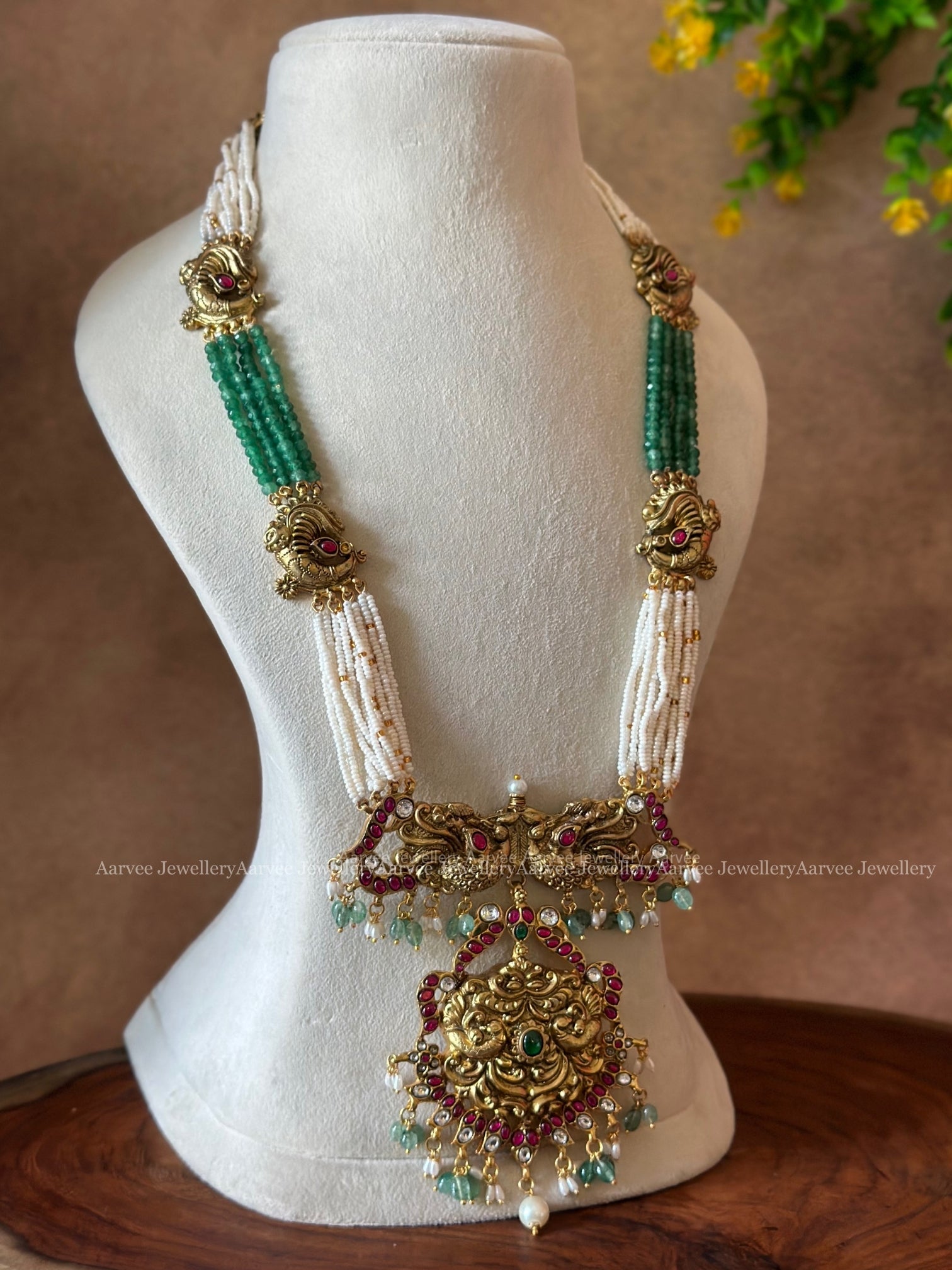 JADAU KUNDAN PEARL & PASTEL BEADED LONG HARAM WITH PEACOCK PENDANT