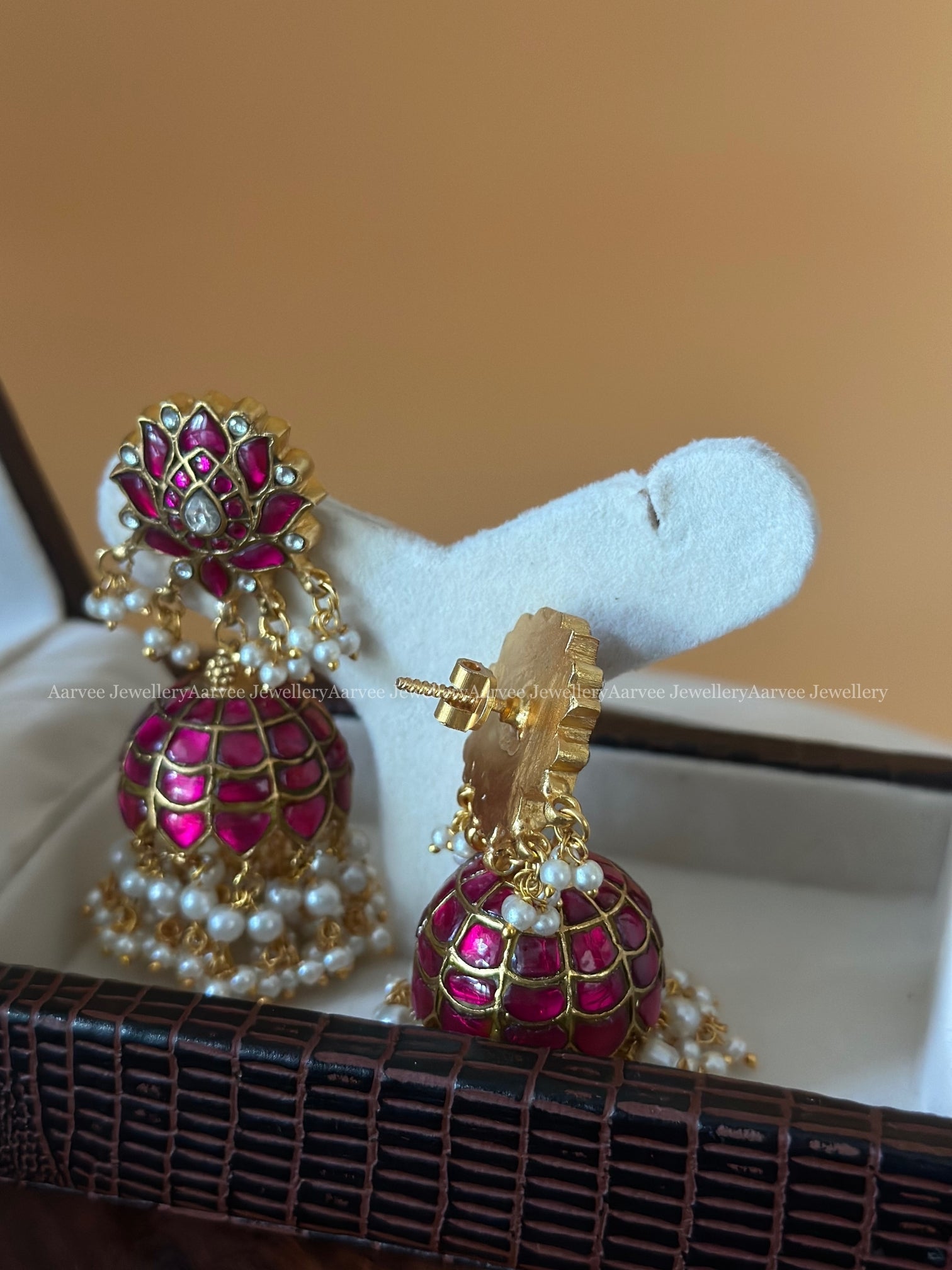 JADAU KUNDAN PINK STONE LOTUS JHUMKI WITH FULL PEARLS