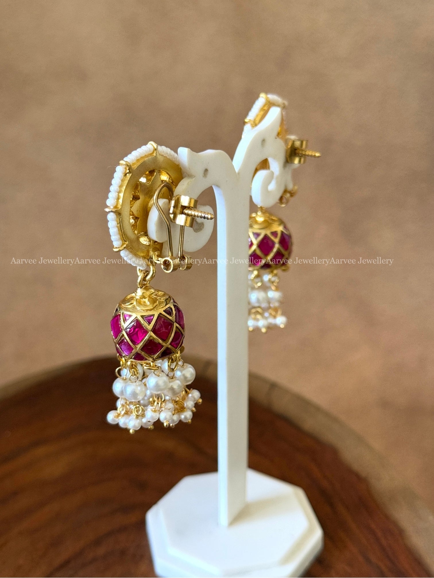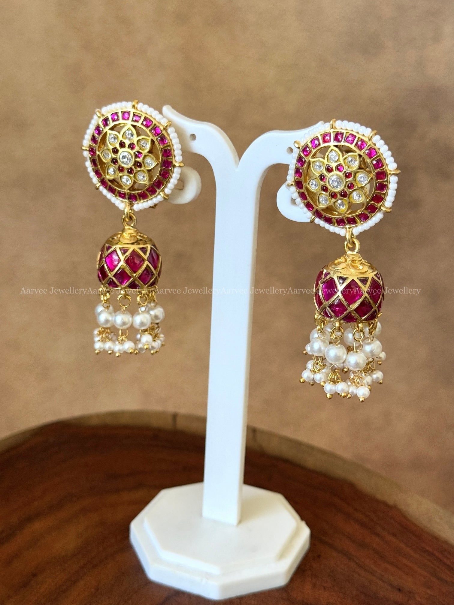 Jadau Kundan Butta Jhumki Earrings with Pink and White Stones and Pearl Accents