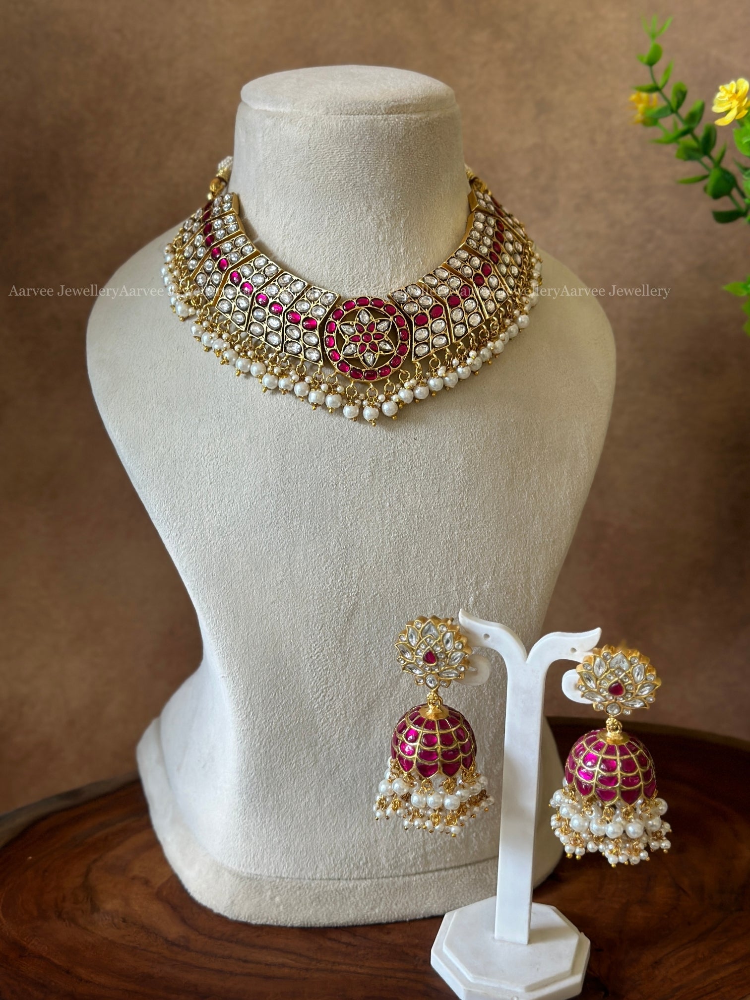 JADAU KUNDAN PINK & WHITE STONE BUTTA NECKLACE WITH LOTUS JHUMKI AND PEARL BEADS