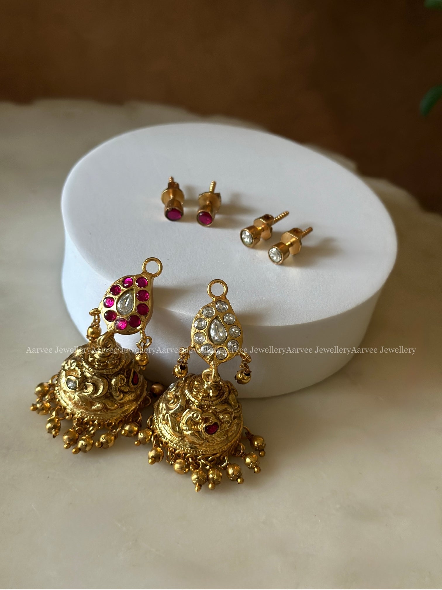 Dual-style jadau kundan earrings featuring a mango design, highlighted by pink and white stones and delicate gold beadwork