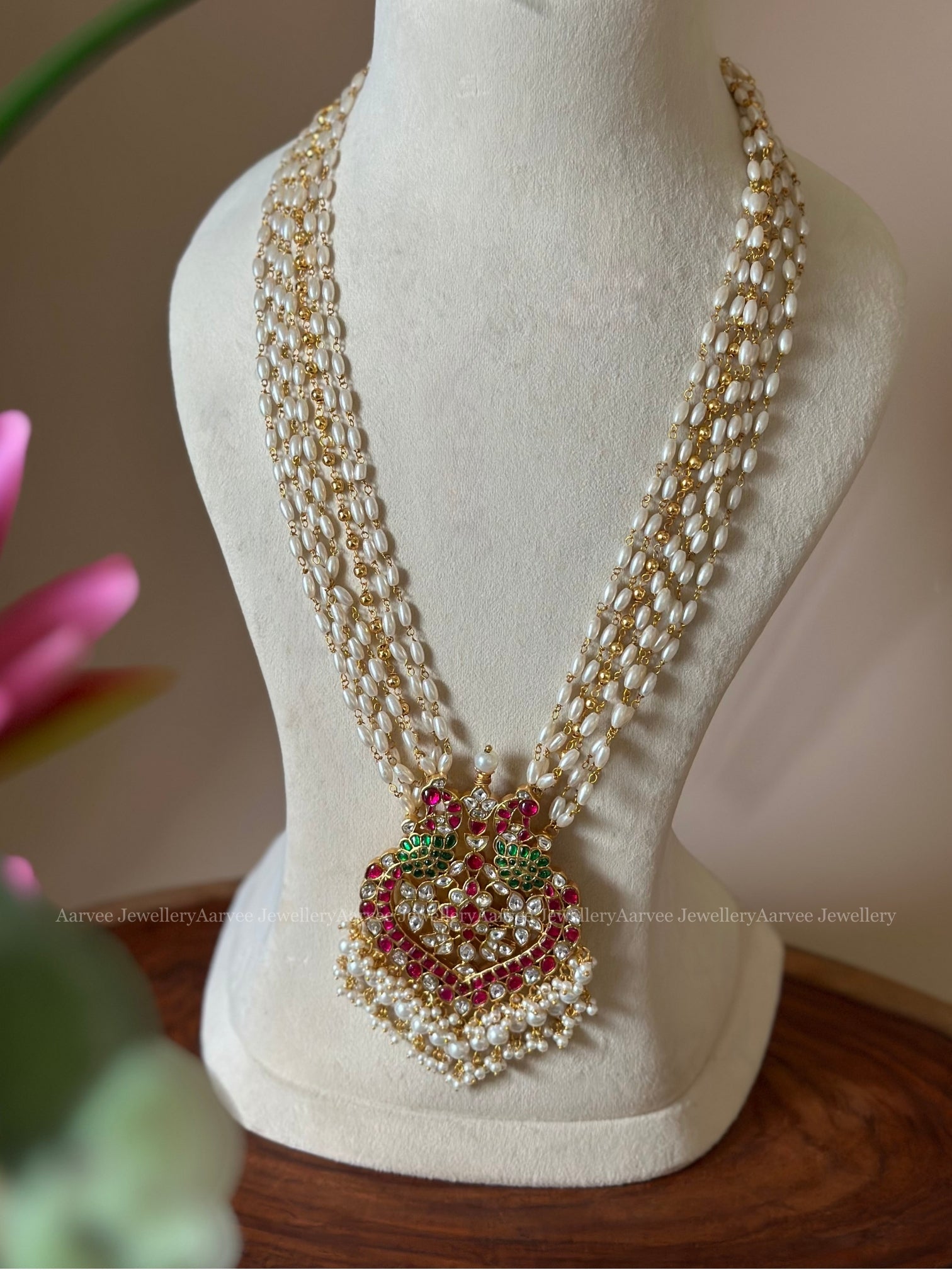JADAU KUNDAN RICE PEARLS LAYERED LONG CHAIN WITH PEACOCK PENDENT