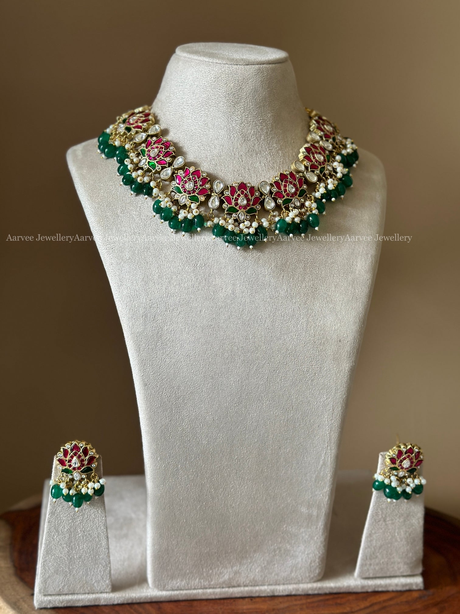 JADAU KUNDAN RUBY STONE LOTUS NECKLACE & STUDS WITH GREEN BEADS