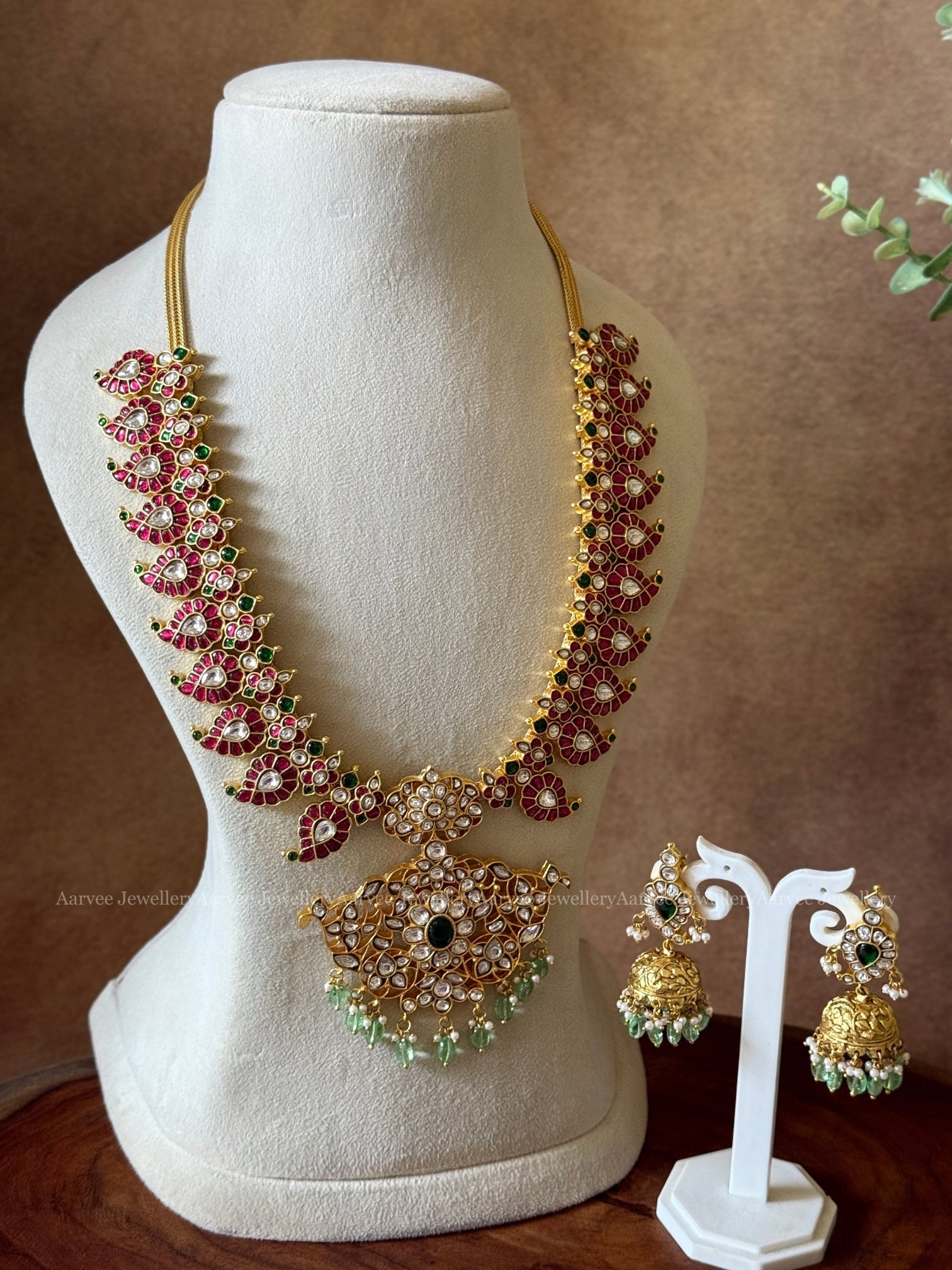 JADAU KUNDAN RUBY STONE MANGO MOTIF MID LENGTH HARAM SET WITH WHITE STONE PENDANT & PASTAL BEADS