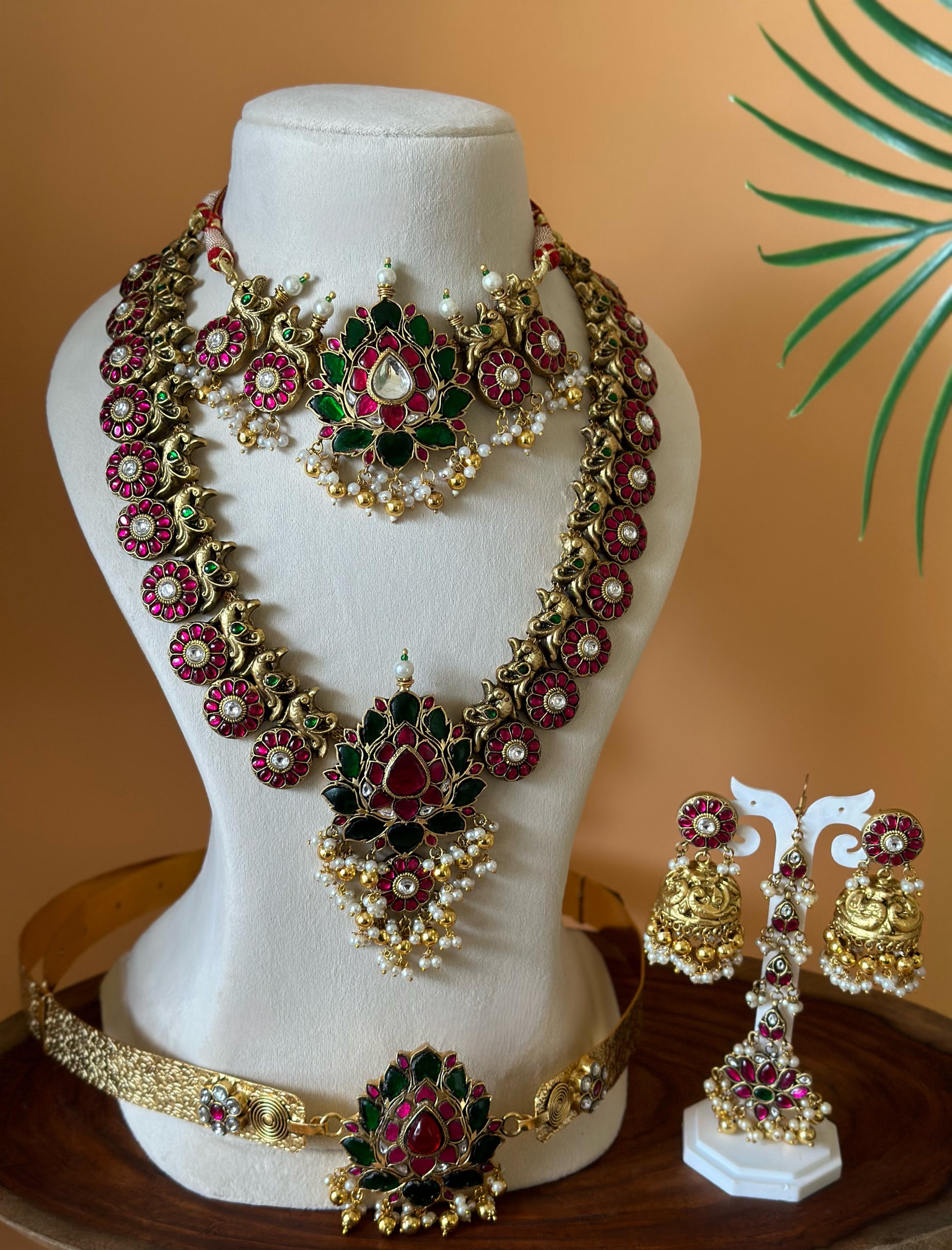 The set Contains : Choker, Haram, Waist Belt, Tikka and a Pair of earrings.