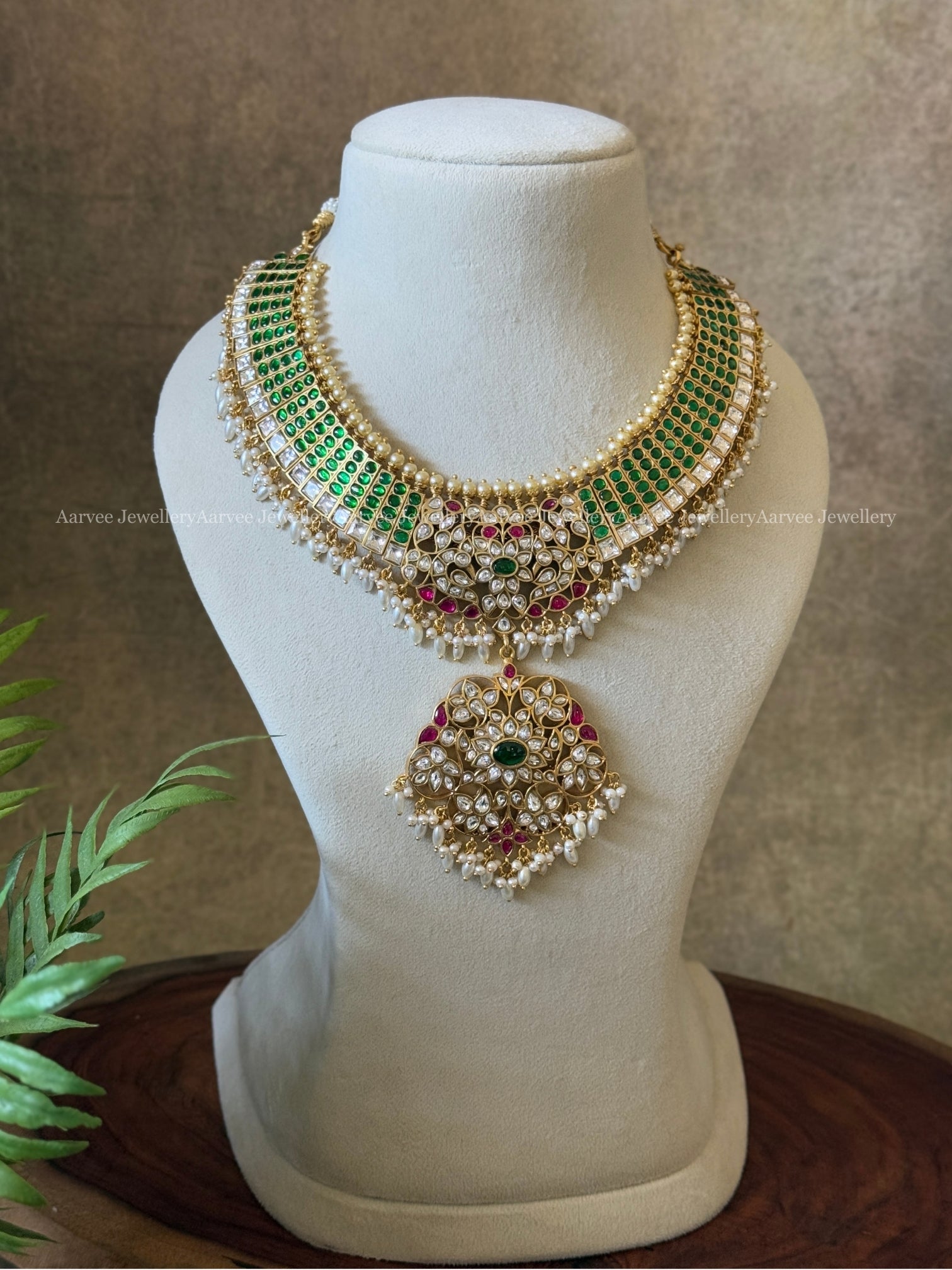 Traditional Jadau Kundan Statement Necklace with Green Gem Accents and Rice Pearl Detailing