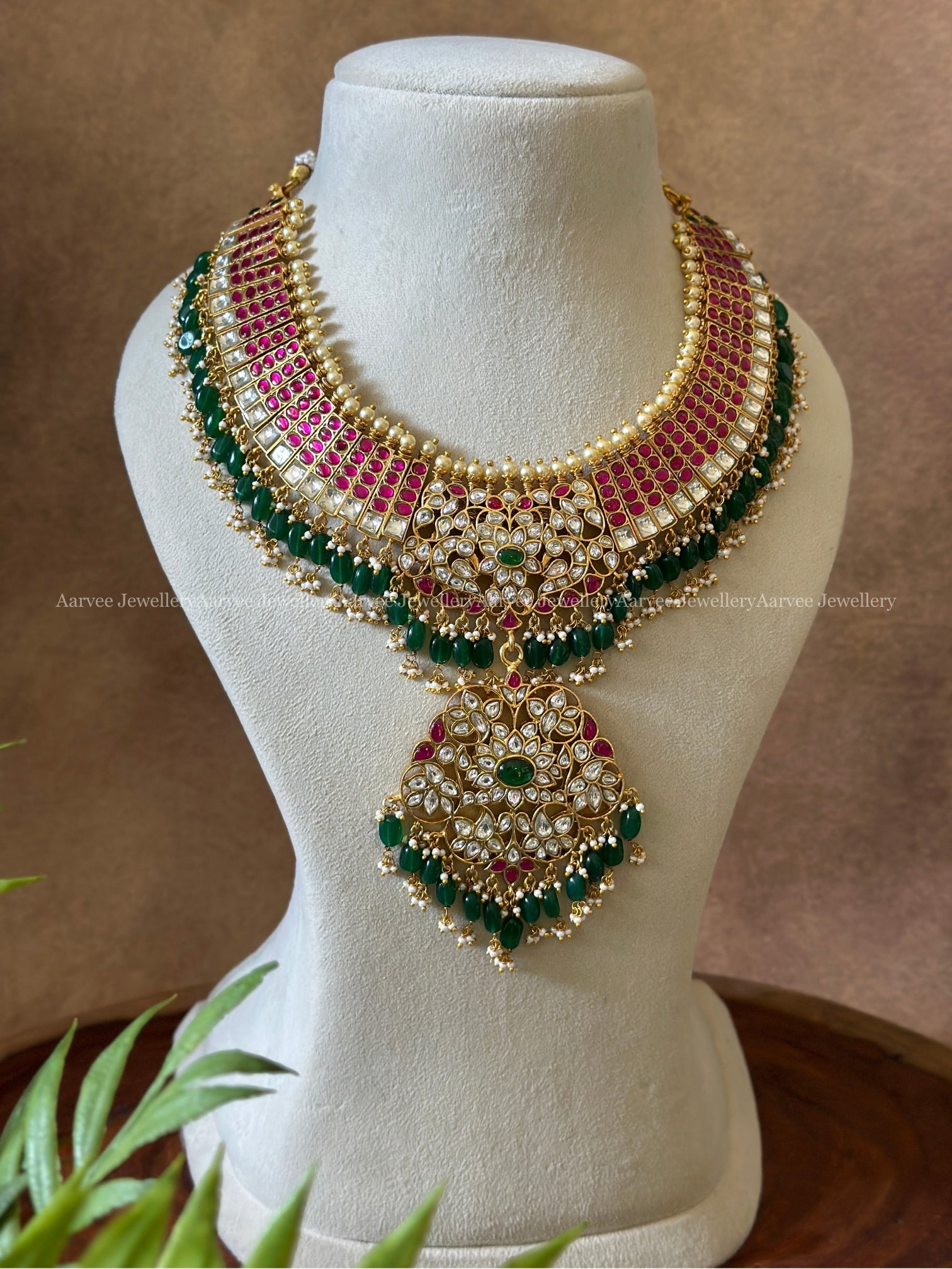 Exquisite Jadau Kundan Statement Necklace with Pink Stones, Green Beads & Central Pendant
