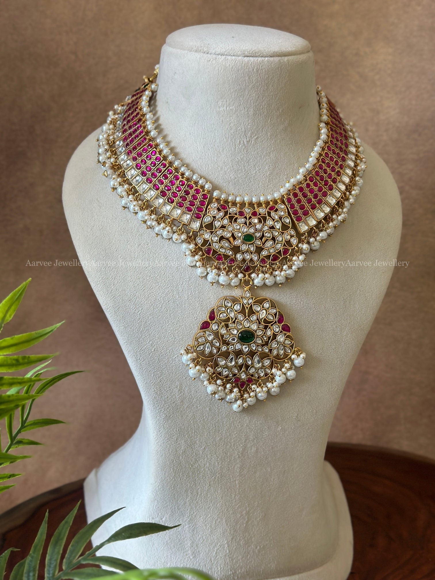 JADAU KUNDAN STATEMENT NECKLACE WITH PINK STONES & PEARLS