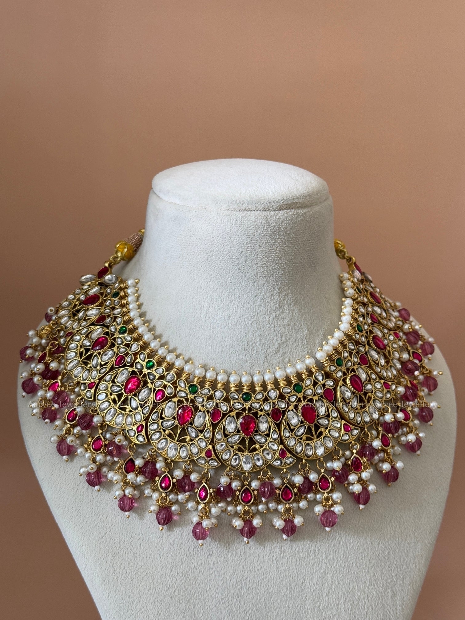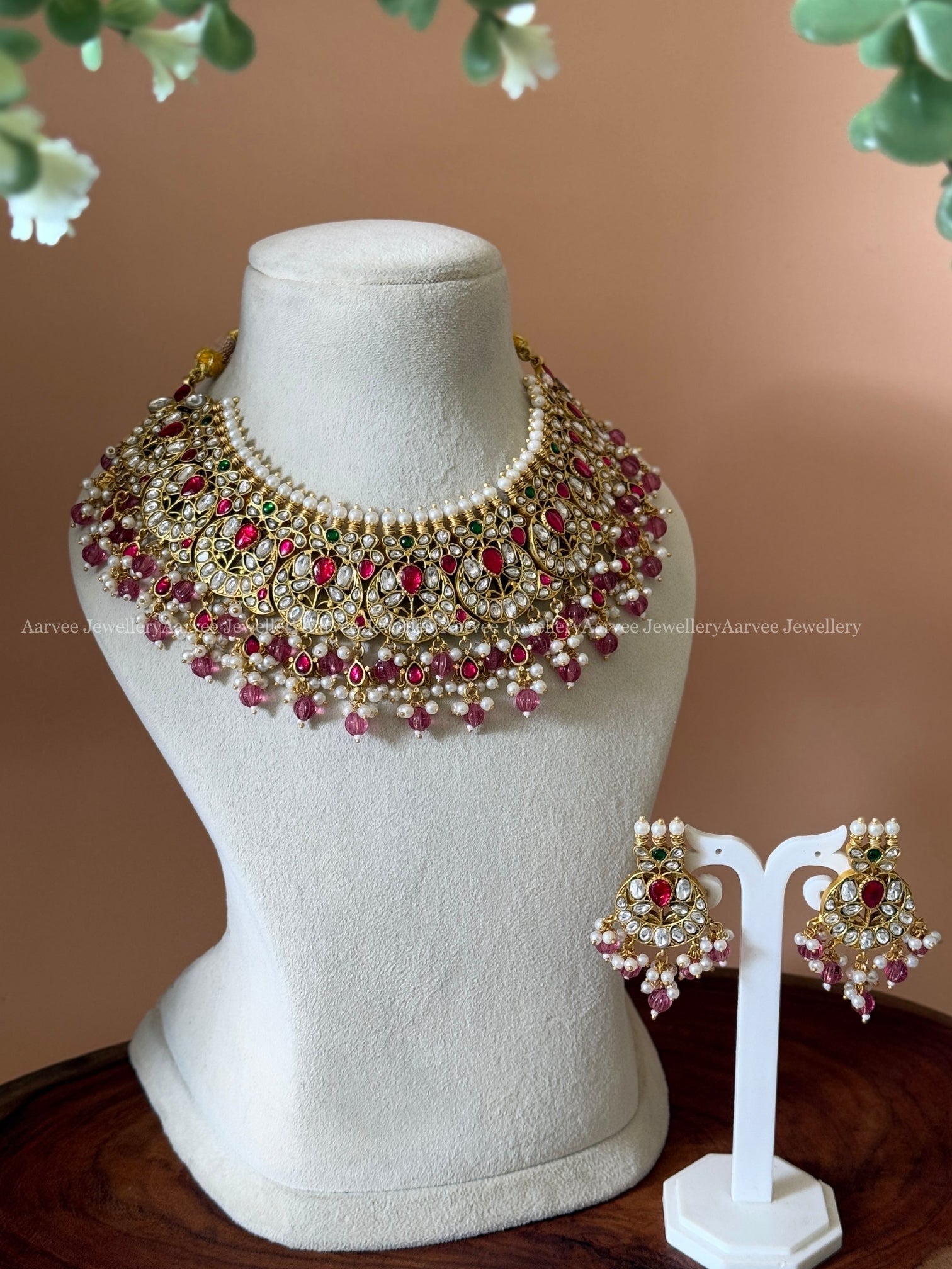 Ornate Bridal Necklace Set in Jadau Kundan, Adorned with Pink-White Stones and Wine-Colored Beads