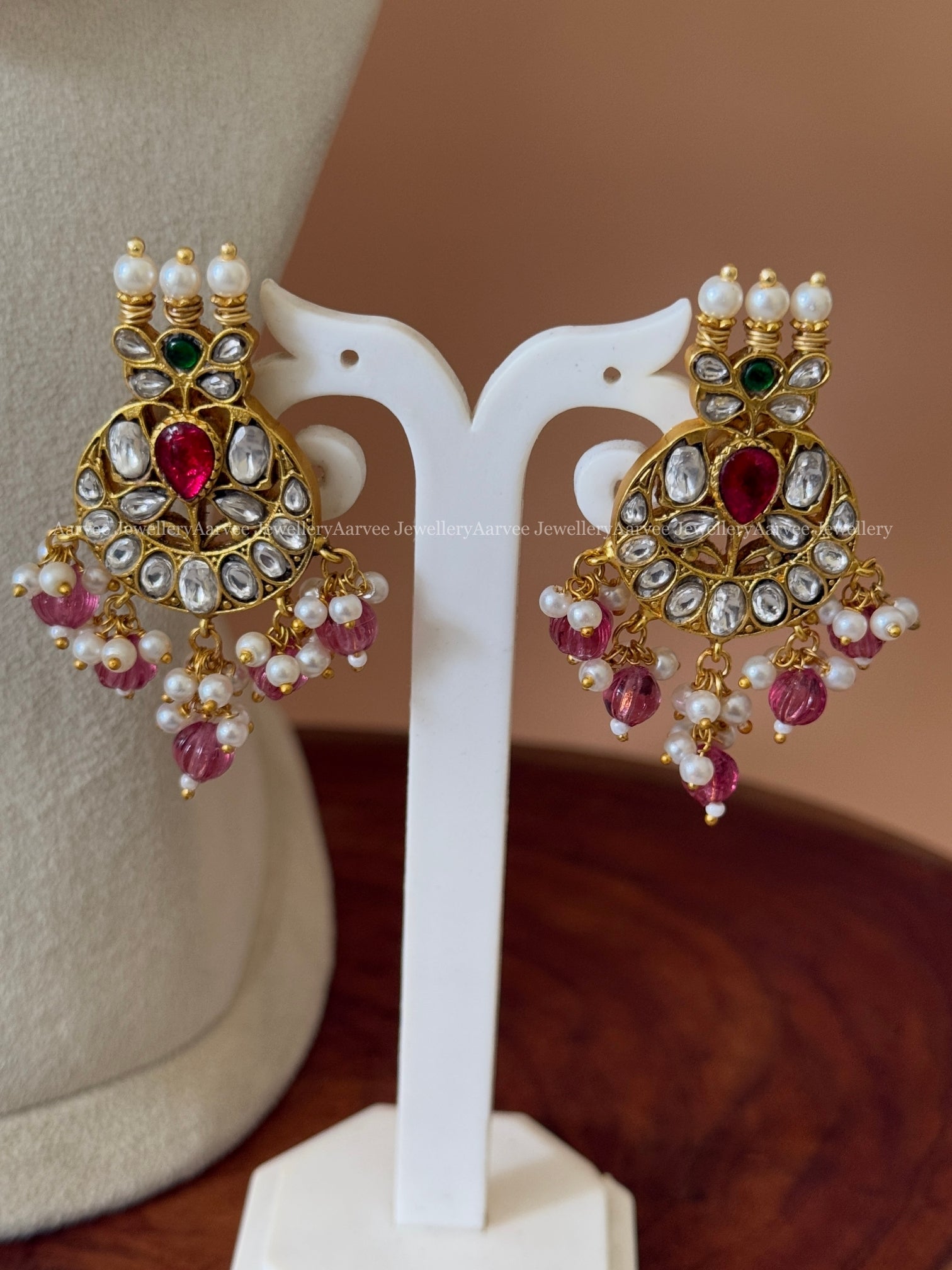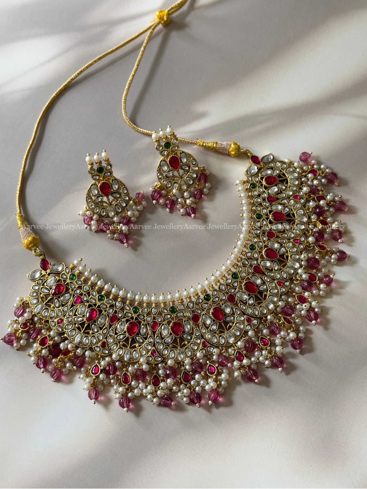 JADAU KUNDAN WHITE / PINK STONES BRIDAL NECKLACE SET WITH WINE COLOR BEADS