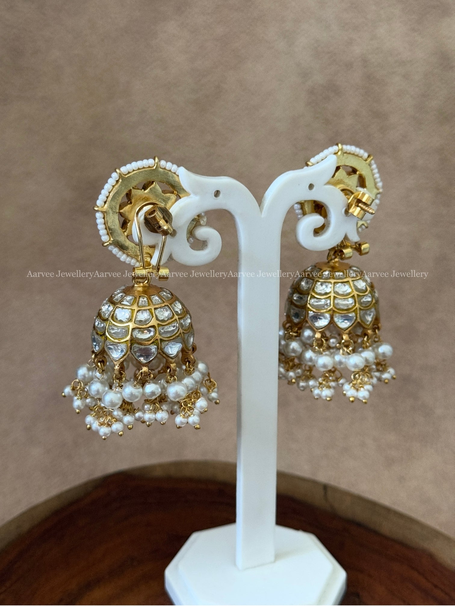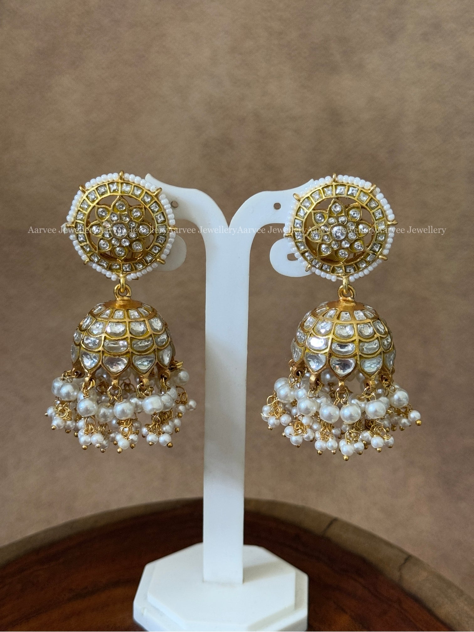 Intricate butta jhumkis in jadau kundan style, decorated with white stone embellishments and graceful pearl drops