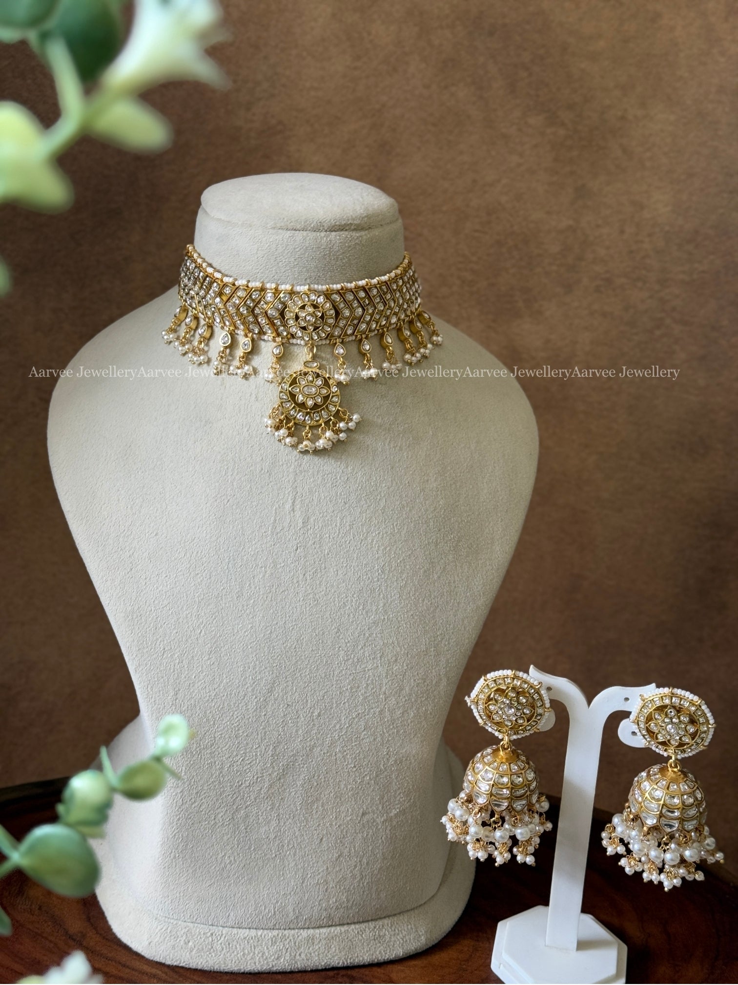 JADAU KUNDAN ADITI WHITE STONE CHOKER SET WITH PEARLS
