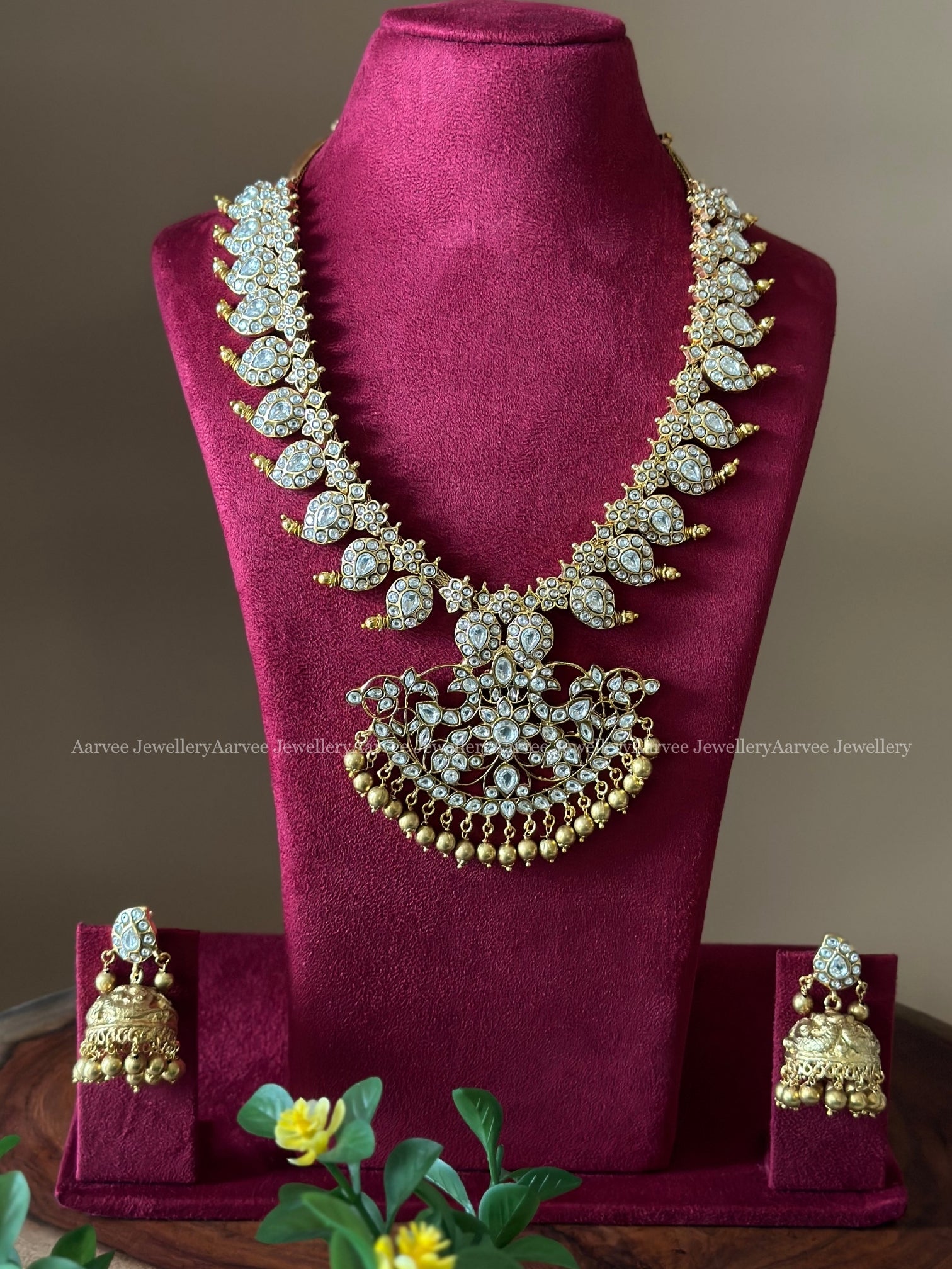 JADAU KUNDAN WHITE STONES MANGO MOTIF NECKLACE SET WITH GOLD BEADS