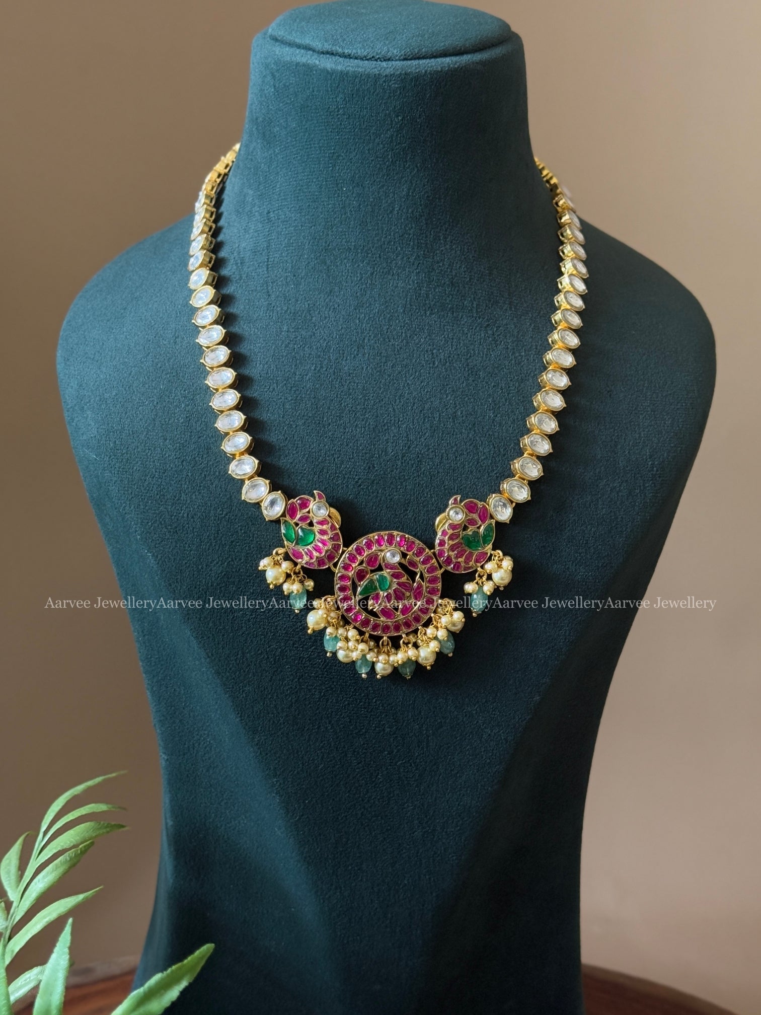 JADAU KUNDAN WHITE STONES NECKLACE WITH PEACOCK MOTIF PENDANT