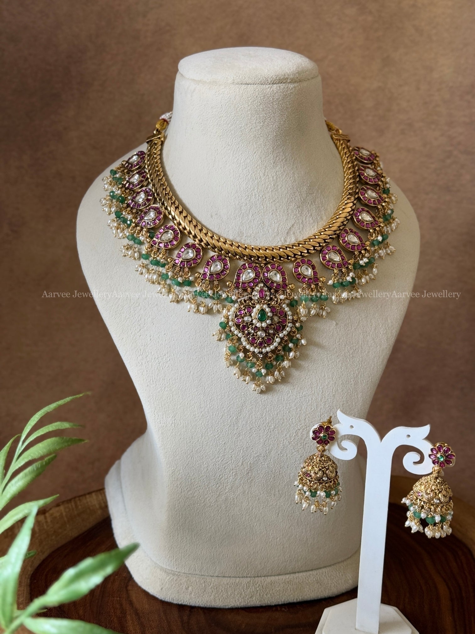 JALEBI MANGO MOTIF NECKLACE SET WITH PINK/WHITE STONES & TINY PASTEL BEADS