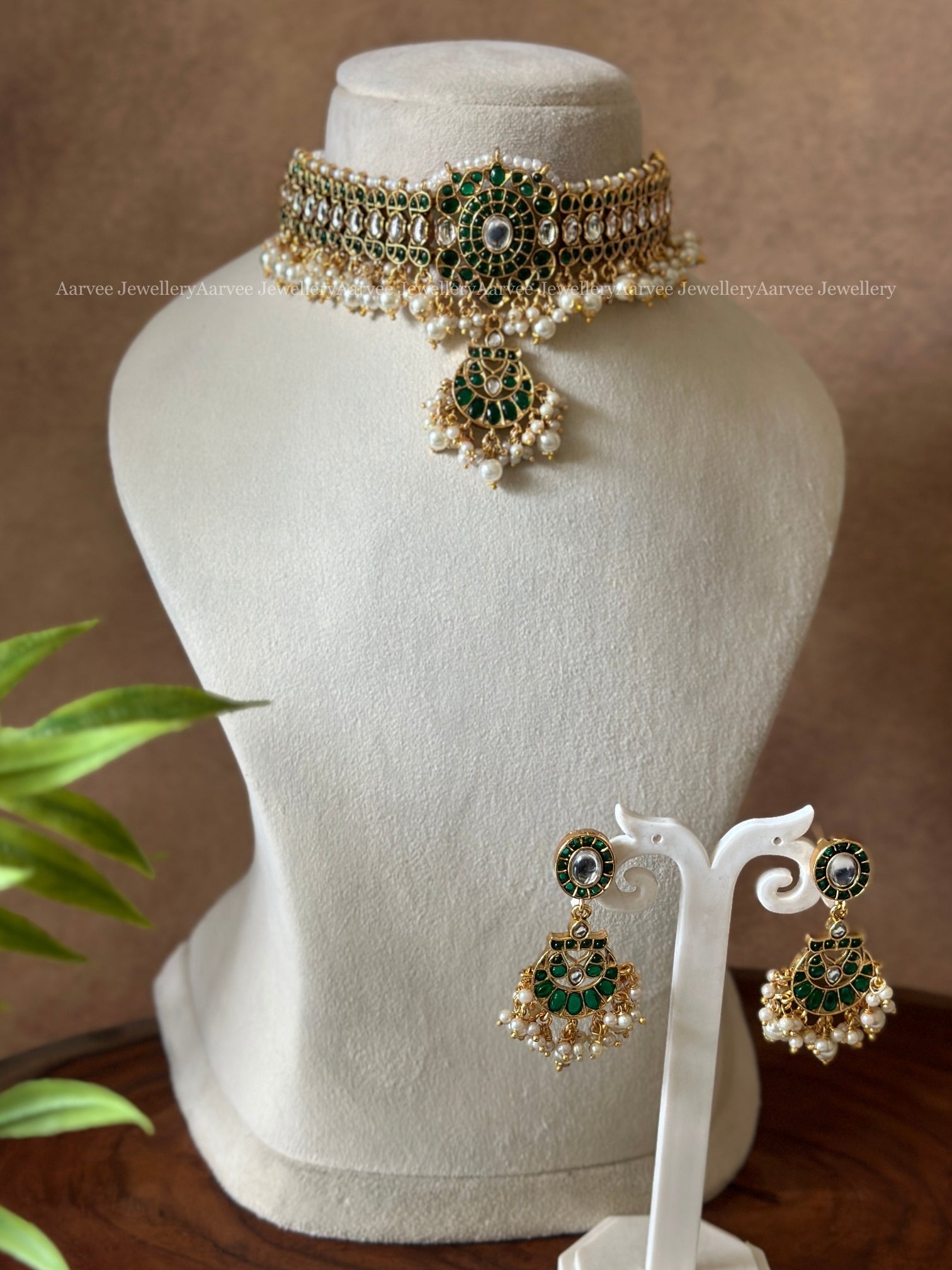 KEMP CHOKER SET WITH GREEN STONES & PEARL BEADS