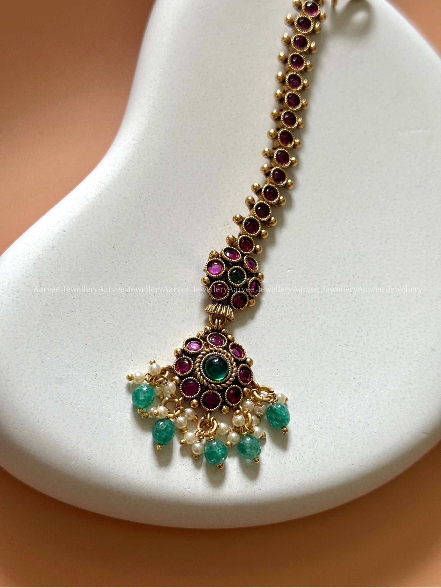 KEMP DEEP RUBY / GREEN STONE FLORAL TIKKA WITH PASTEL BEADS