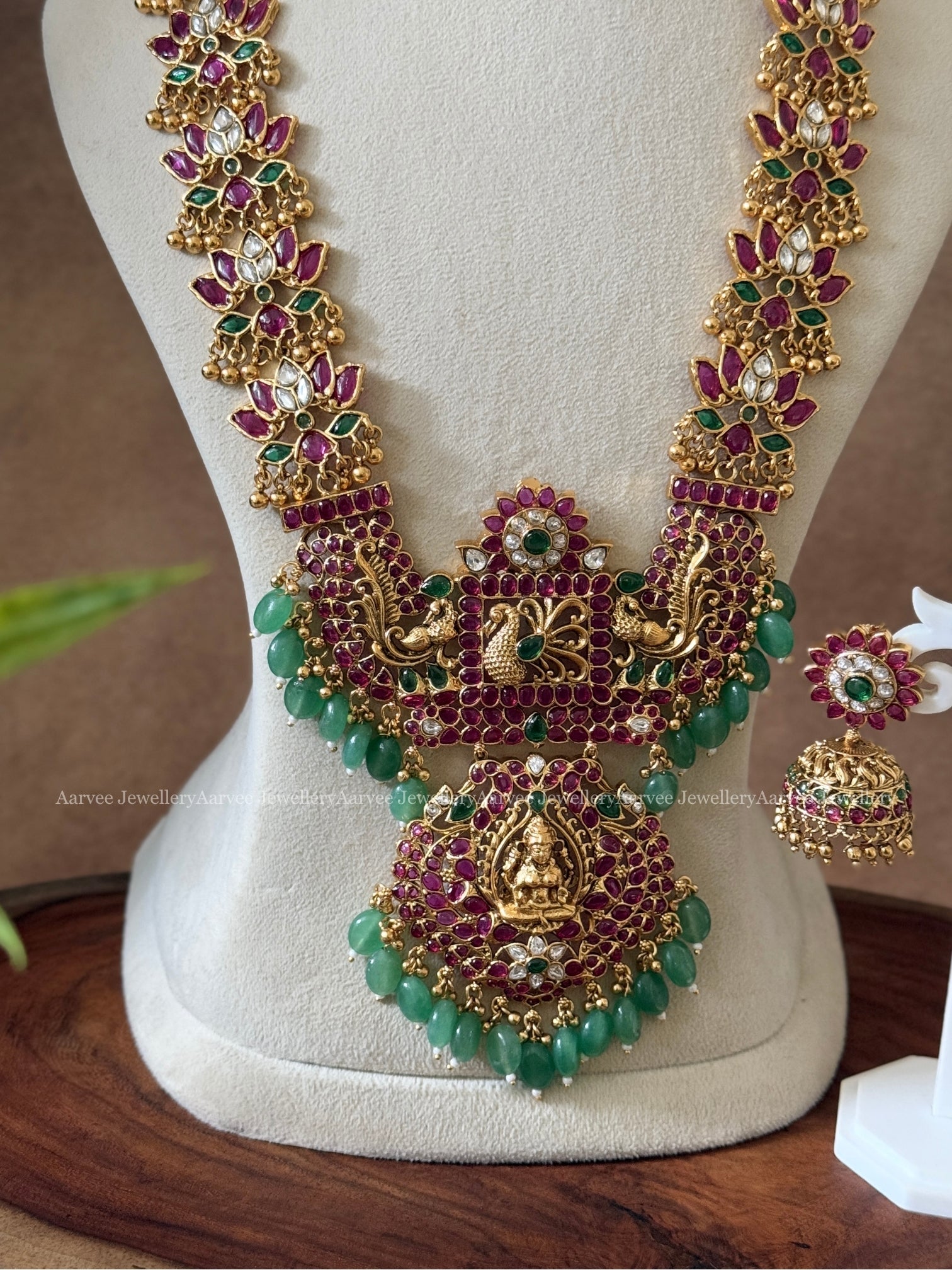 KEMP MULTI COLOR STONES LOTUS MOTIF HARAM SET WITH LAKSHMI PENDANT AND PASTEL BEADS