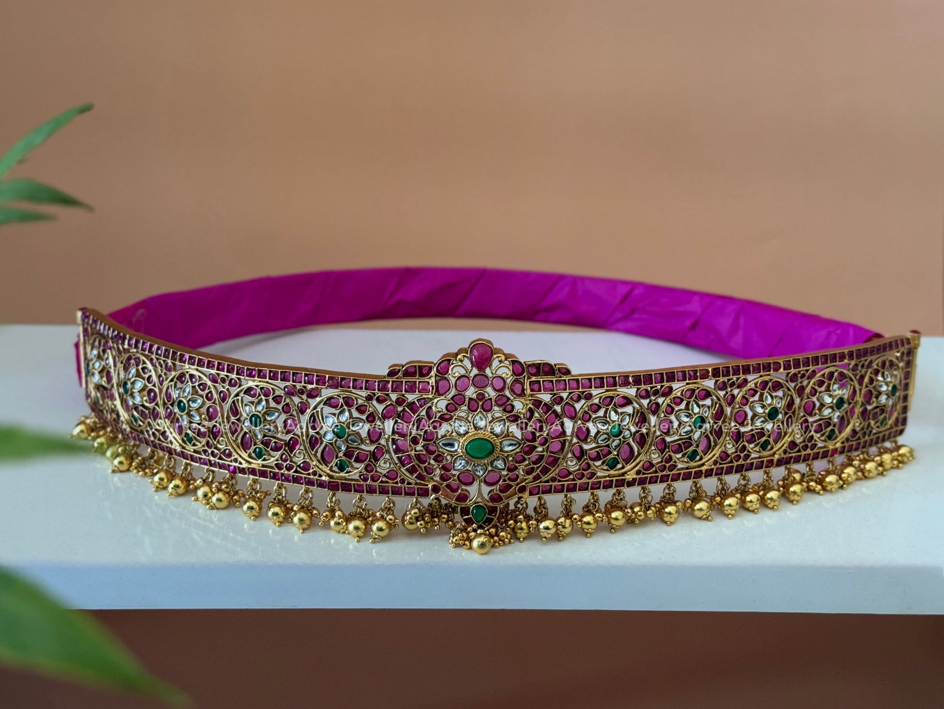 A stunning waist accessory crafted with vibrant Kemp stones and elegant gold beads. Perfect for adding a traditional, festive touch to sarees and lehengas.