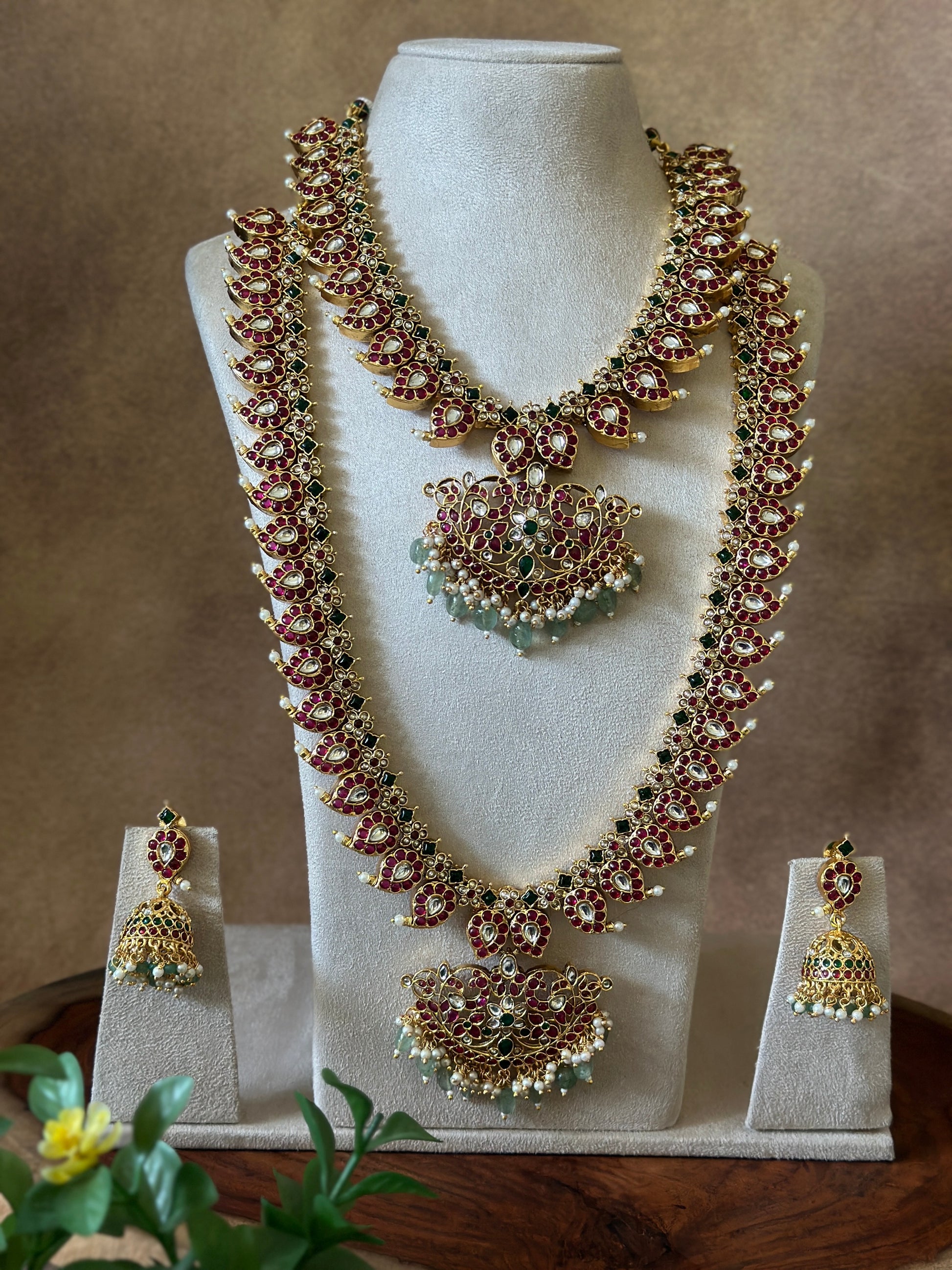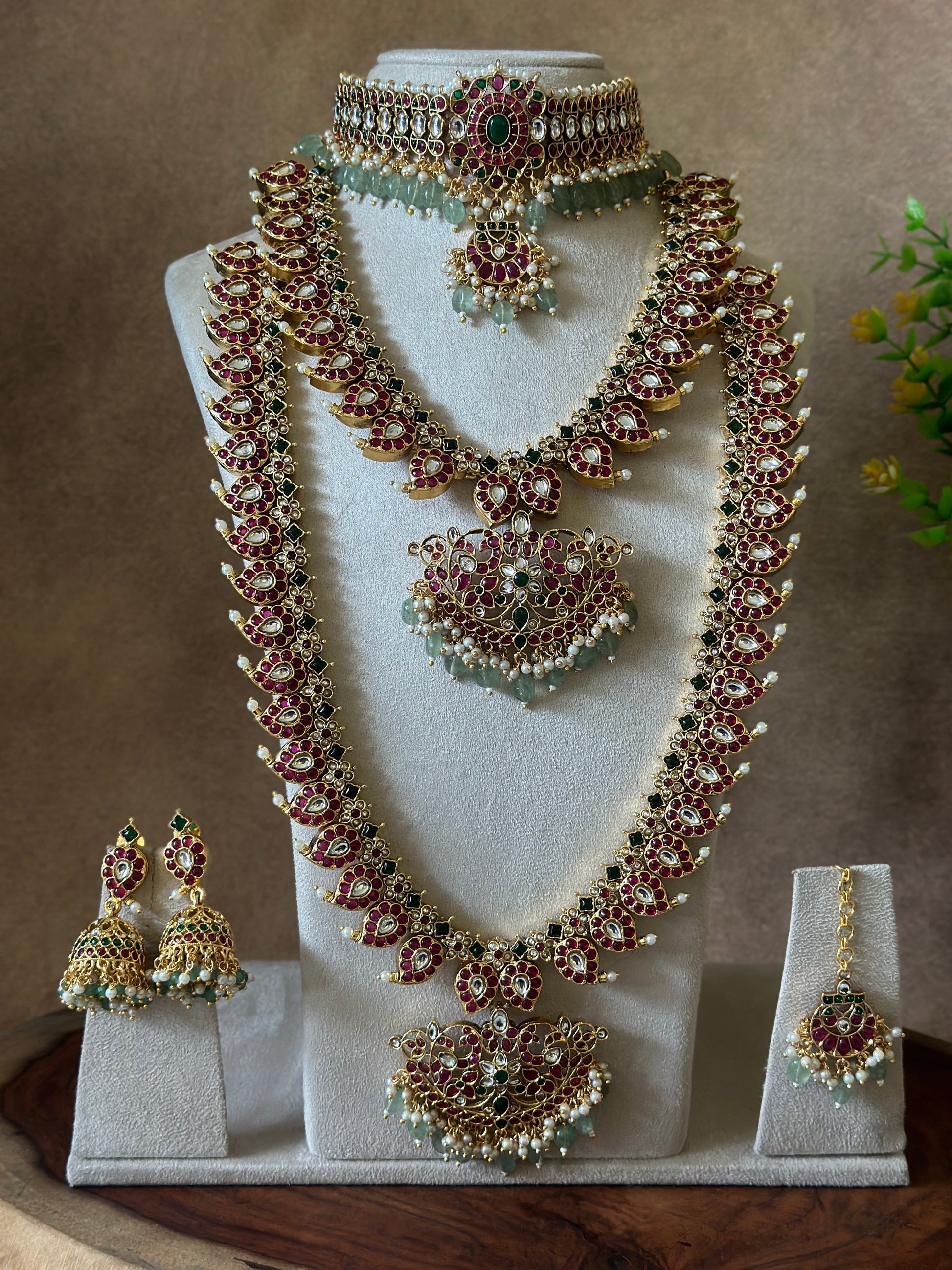 The set contains : A choker, Necklace, Haram, Tikka & one Pair of Jhumki.