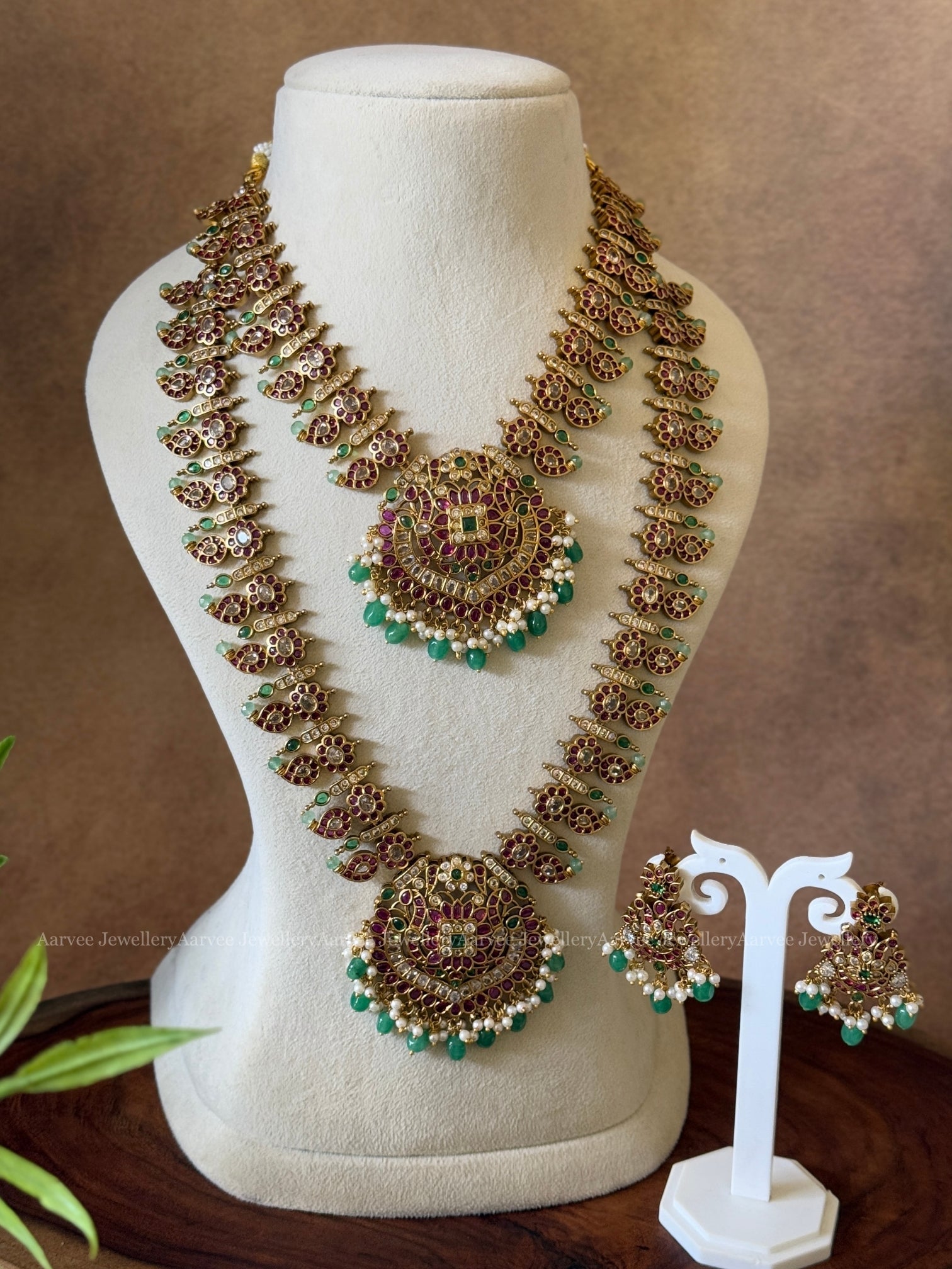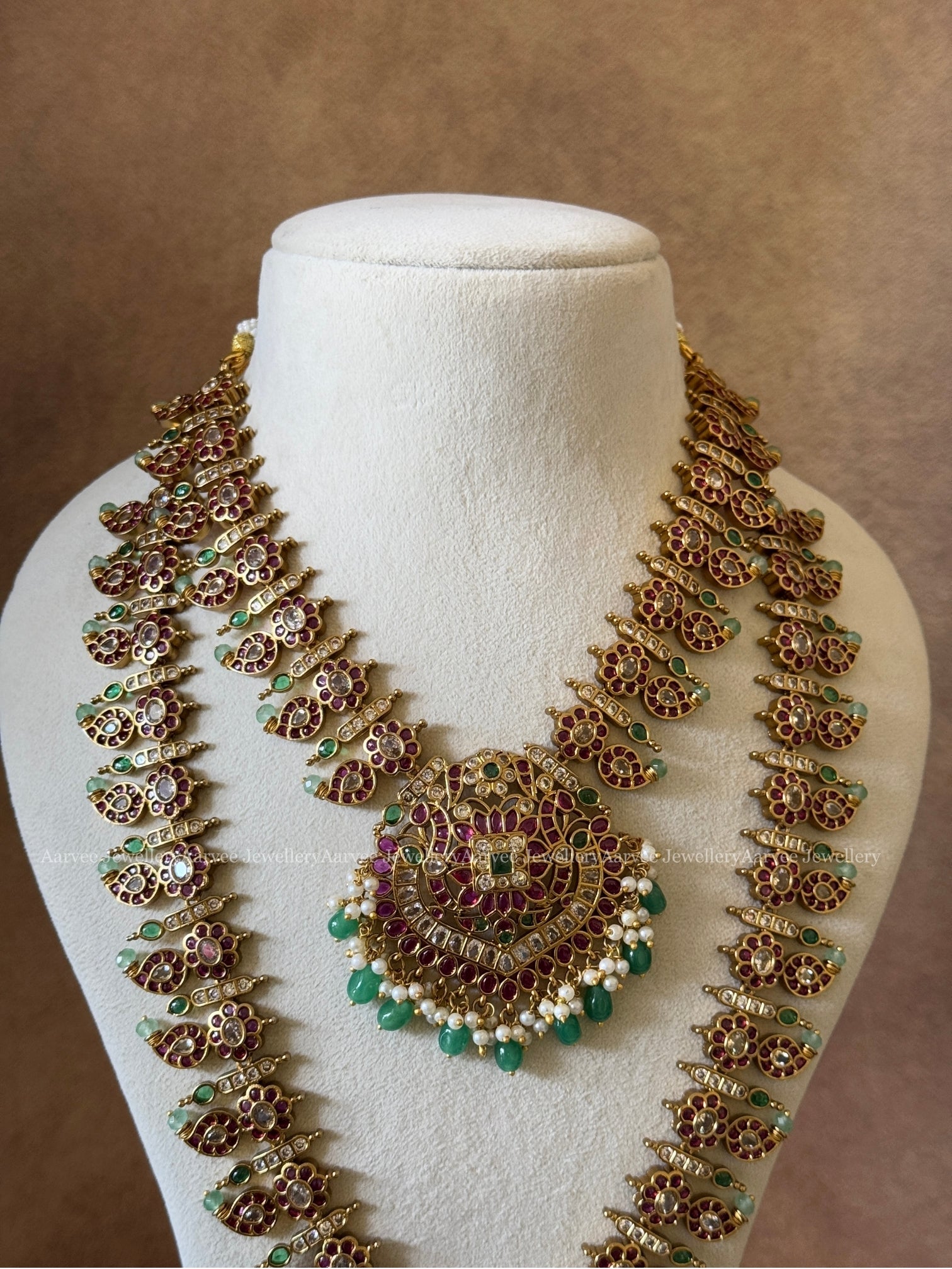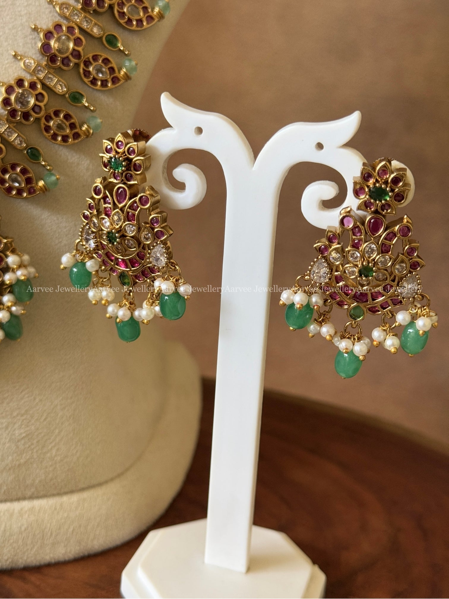 KEMP SEMI BRIDAL JEWELLERY SET WITH PEACOCK PENDANT WITH RUBY STONES & PASTEL BEADS