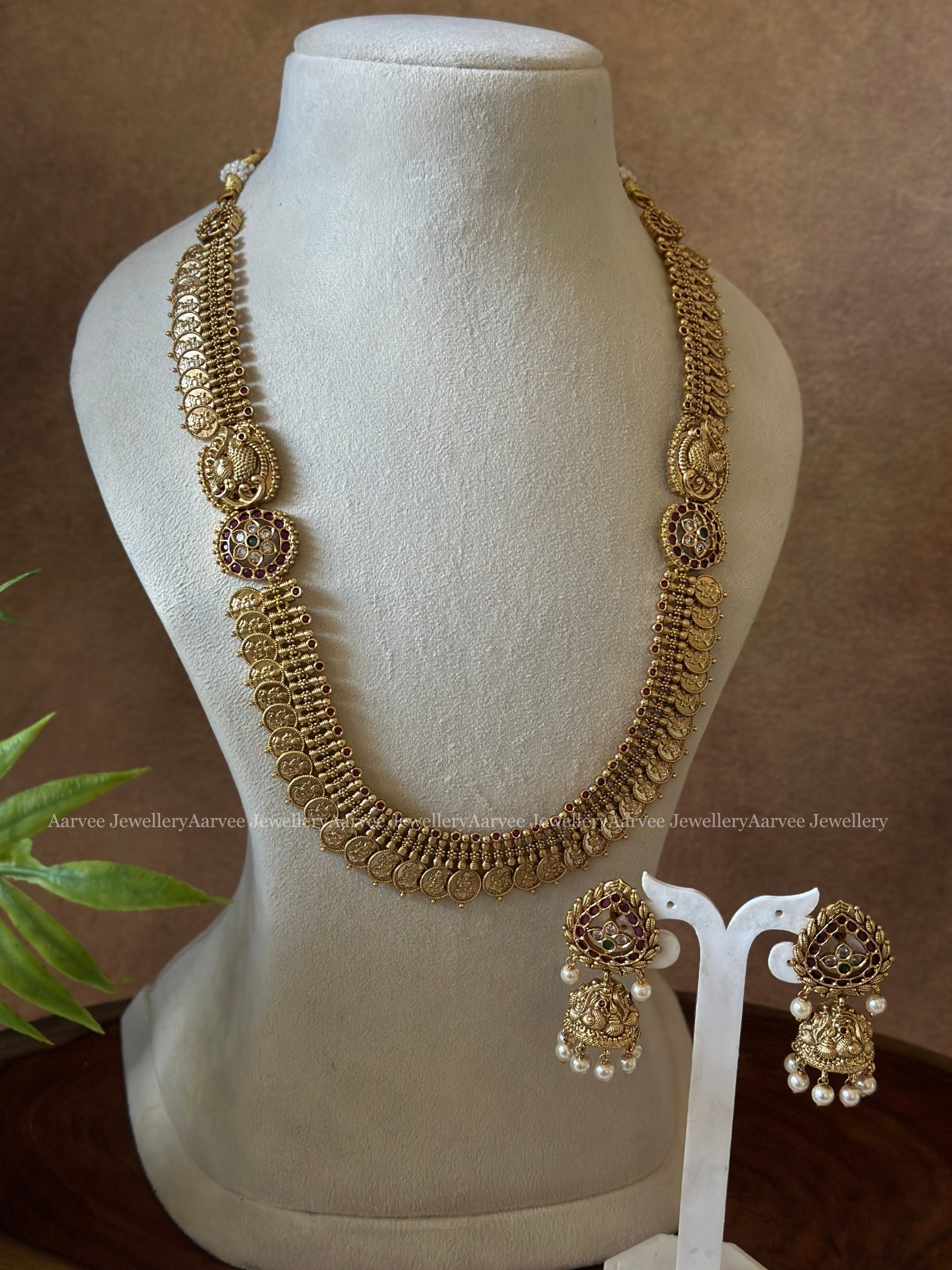 Heritage-style mid-length haram with Kemp stones and intricately crafted Lakshmi coins