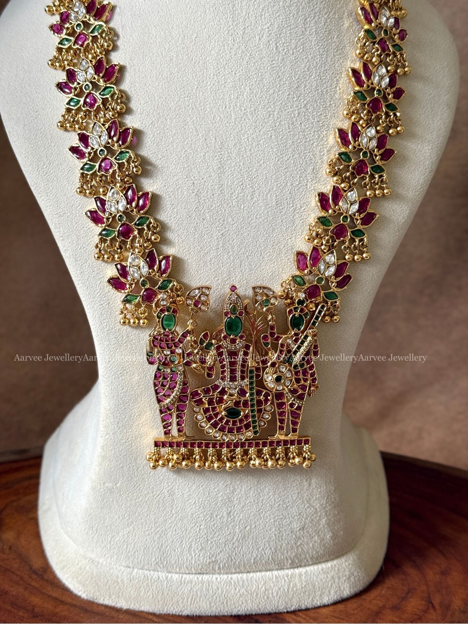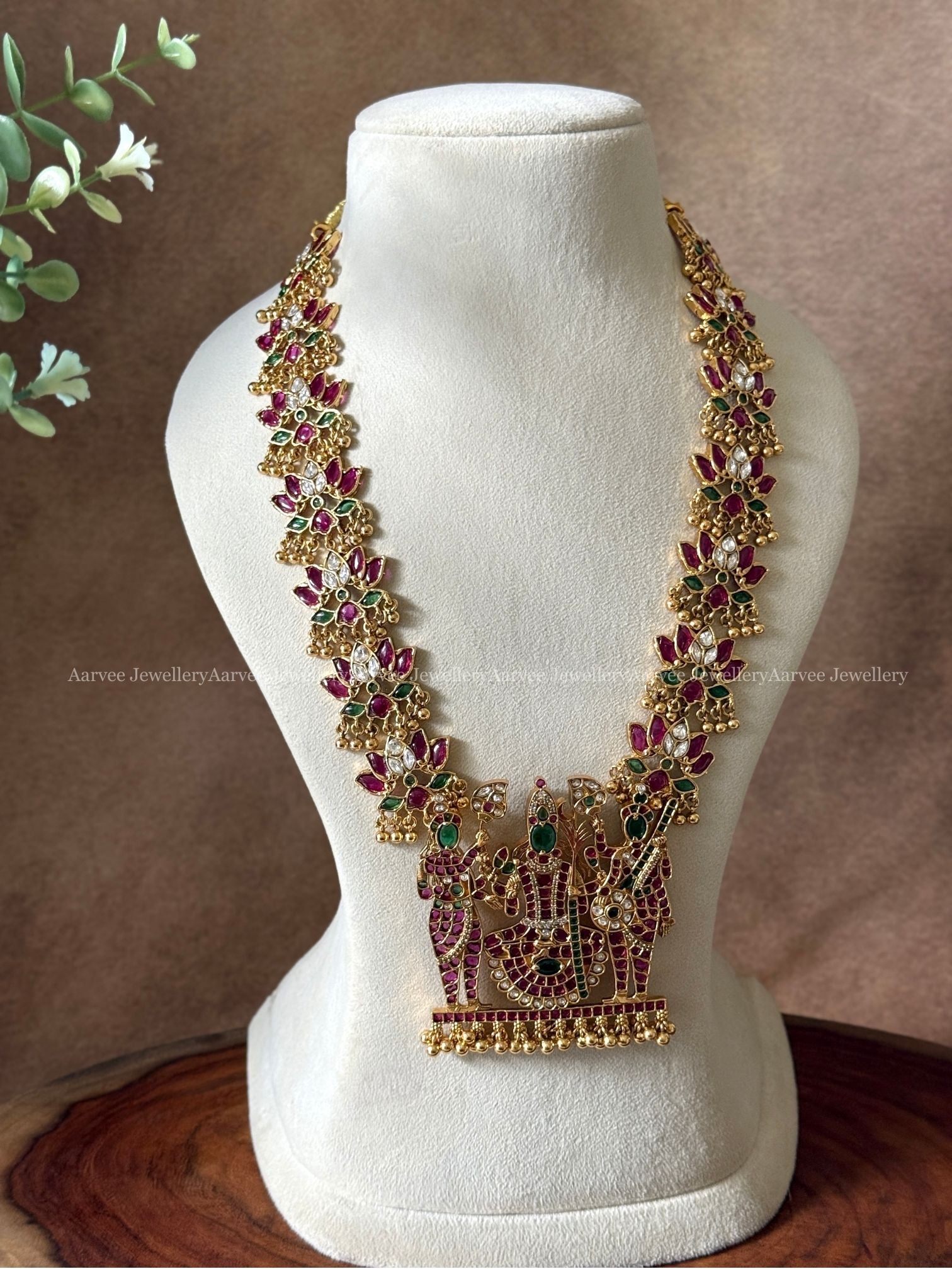Ornate Haram with Lotus Motifs in Kemp Stones and a Radiant Kanchi Kamakshi Centerpiece