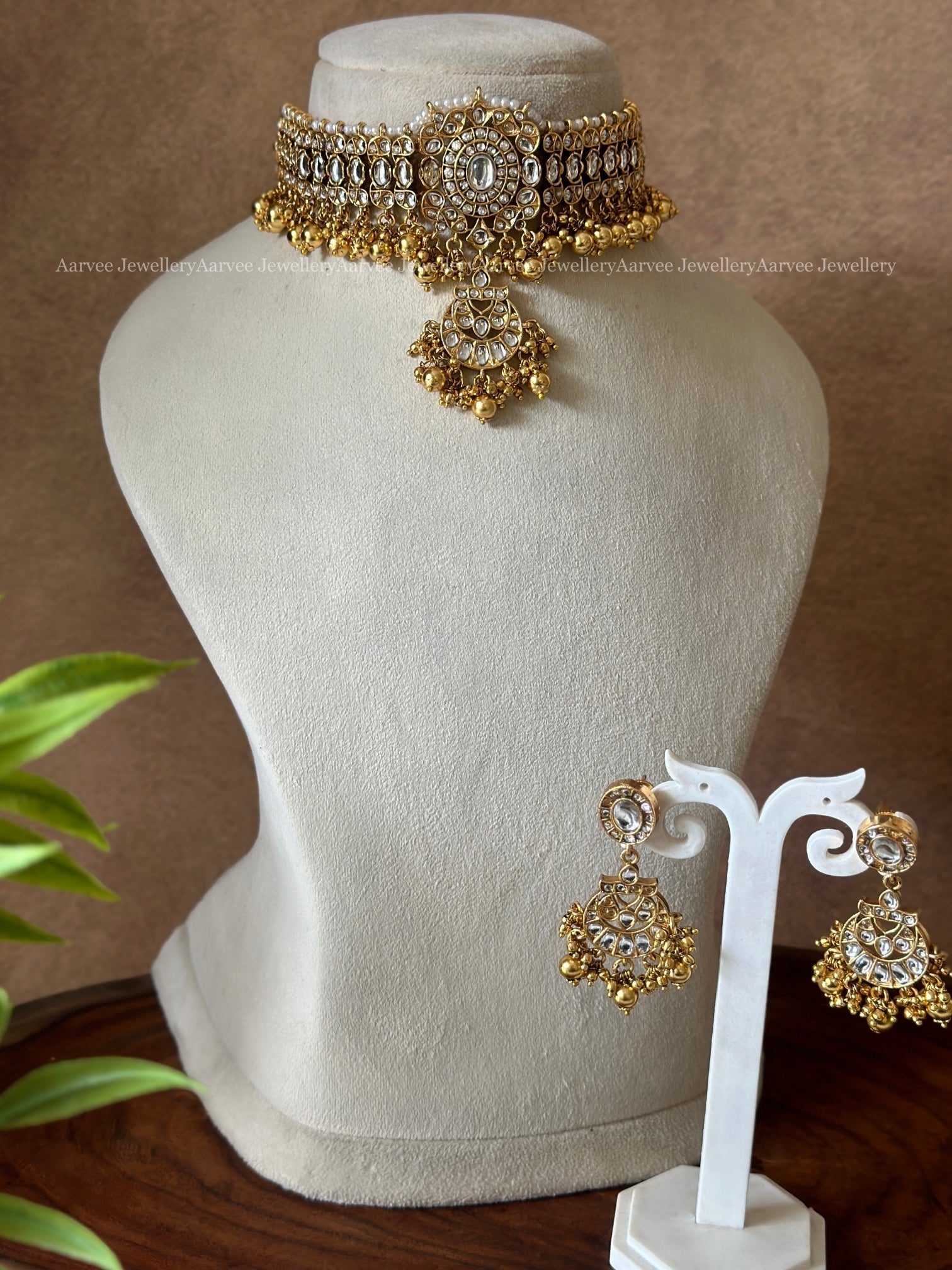 KUNDAN CHOKER SET WITH WHITE STONES & GOLD BEADS