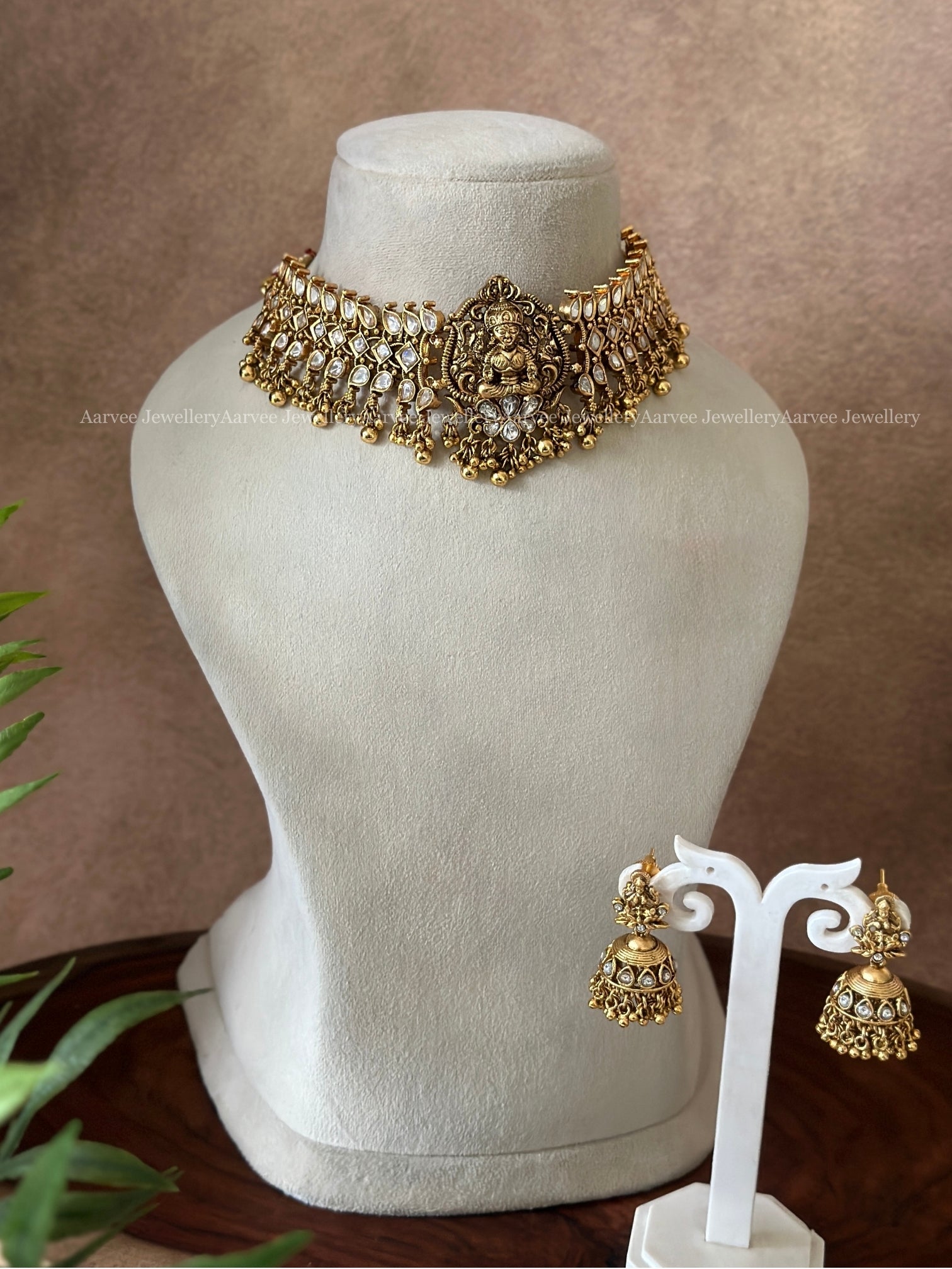 Stunning White Stone Lakshmi Choker in Kundan with Gold Bead accents for a traditional touch
