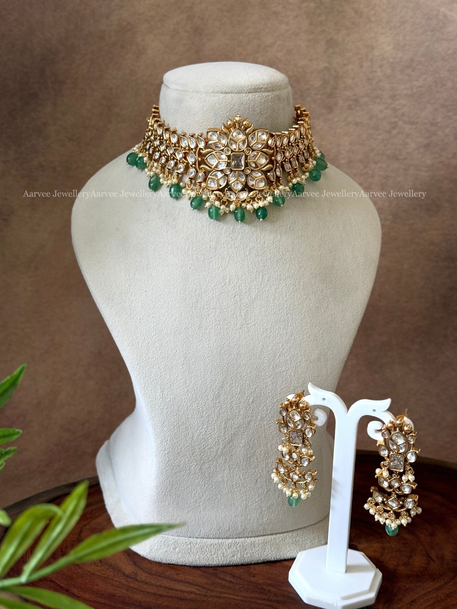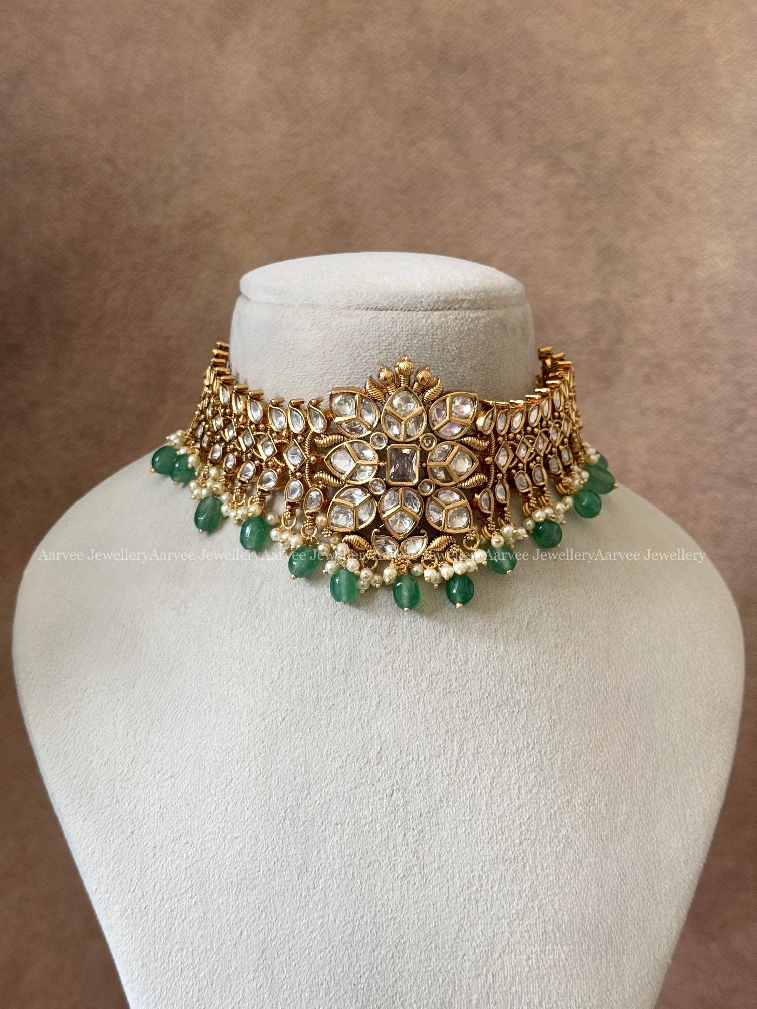 Graceful Kundan Choker Necklace Set with Floral Motifs and Subtle Pastel Beads