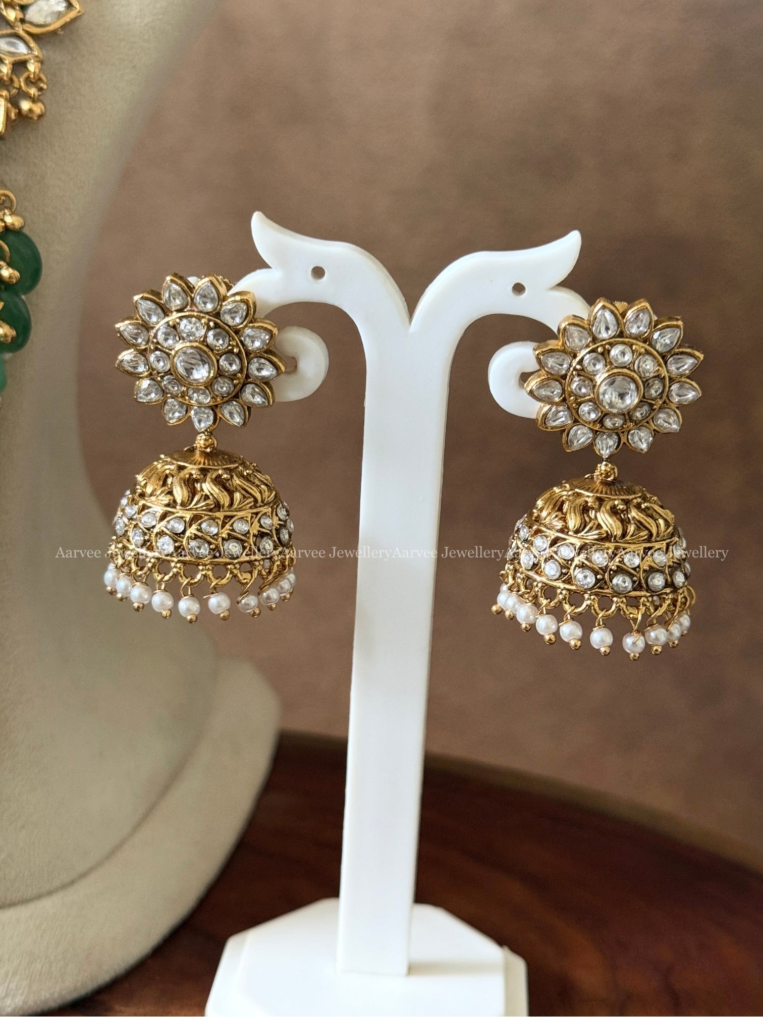 KUNDAN WHITE STONES LOTUS MOTIF HARAM SET WITH LAKSHMI PENDANT AND PASTEL BEADS