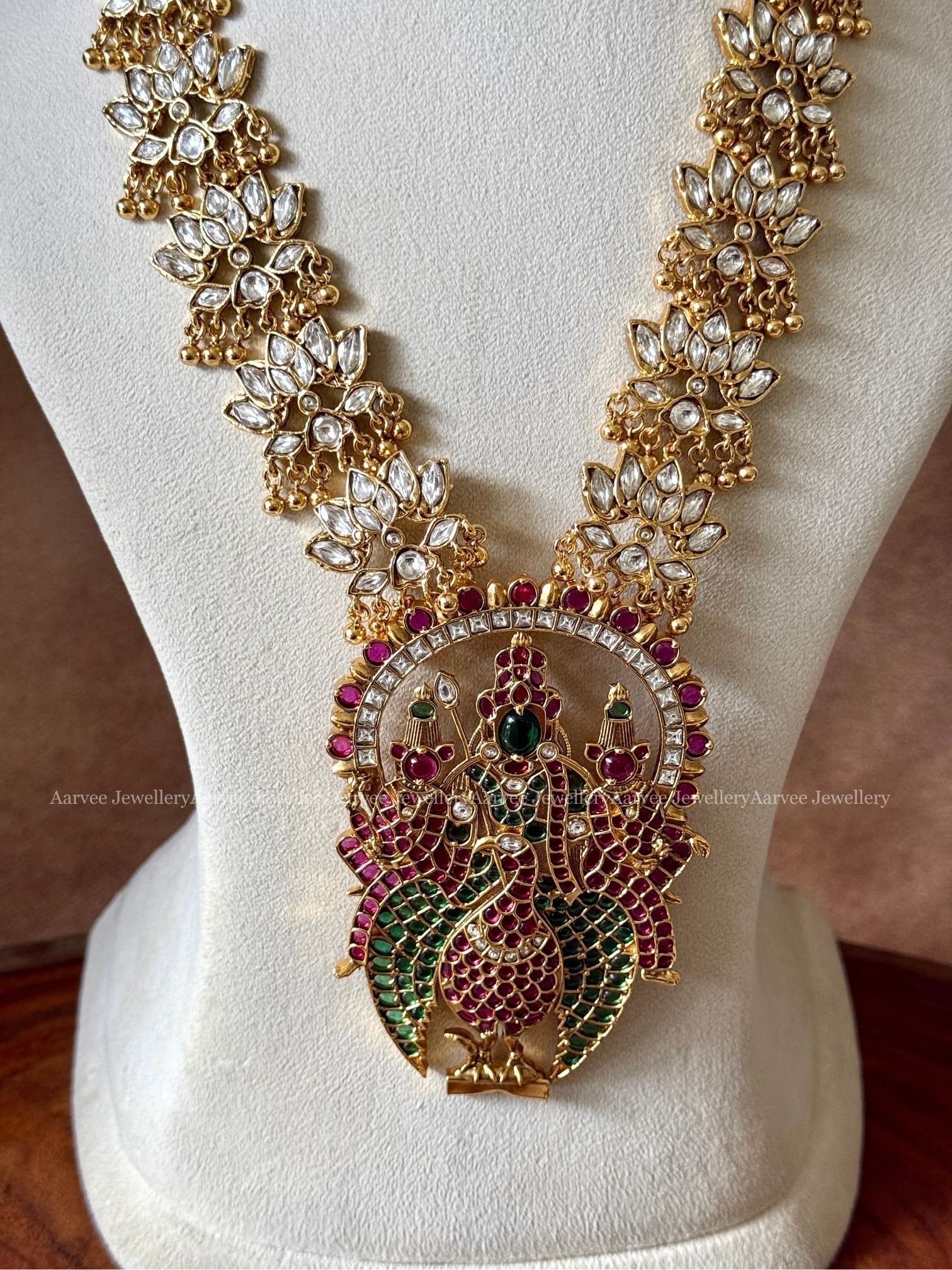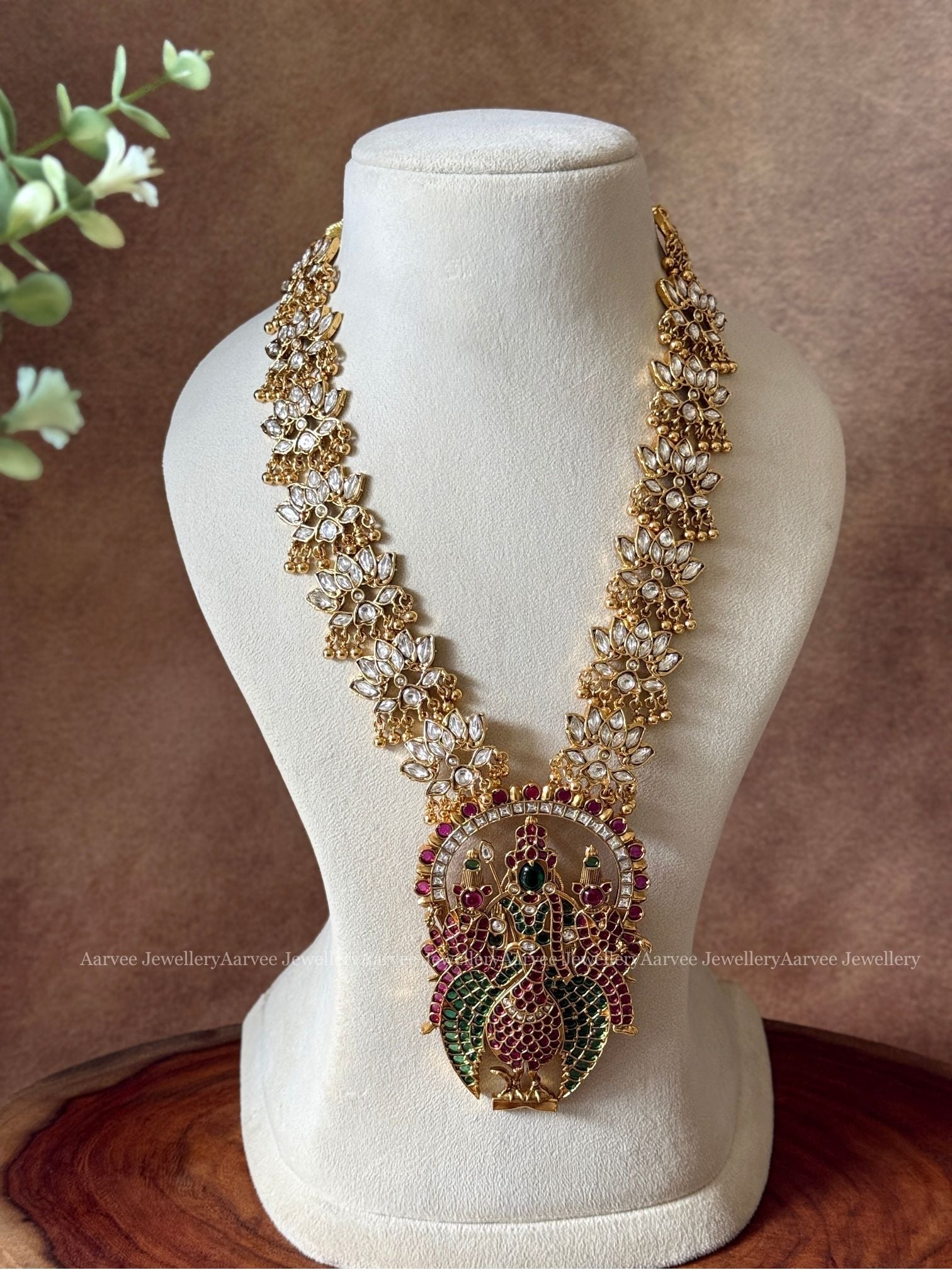Traditional Lotus Motif Haram Embellished with White Kundan and a Kemp Stone Lord Murugan Pendant