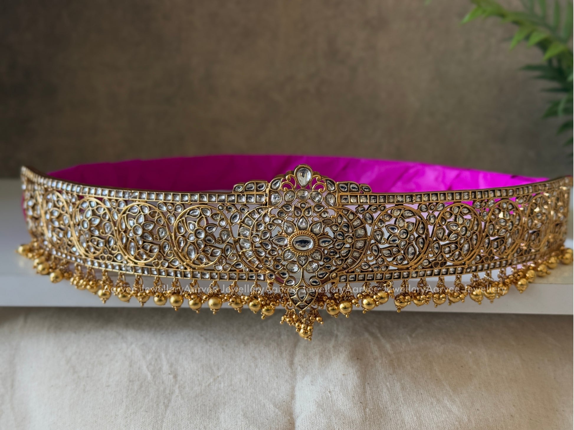 KUNDAN WHITE STONES WAIST BELT WITH GOLD BEADS