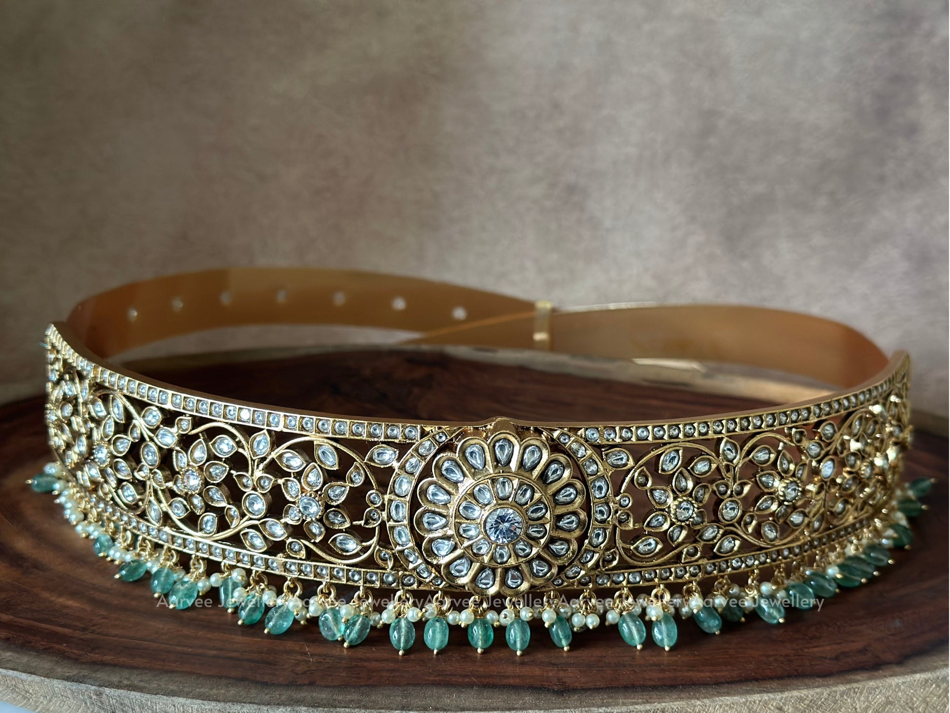 A delicate waistbelt featuring white Kundan stones paired with soft pastel beads, offering a graceful and elegant touch to traditional attire.