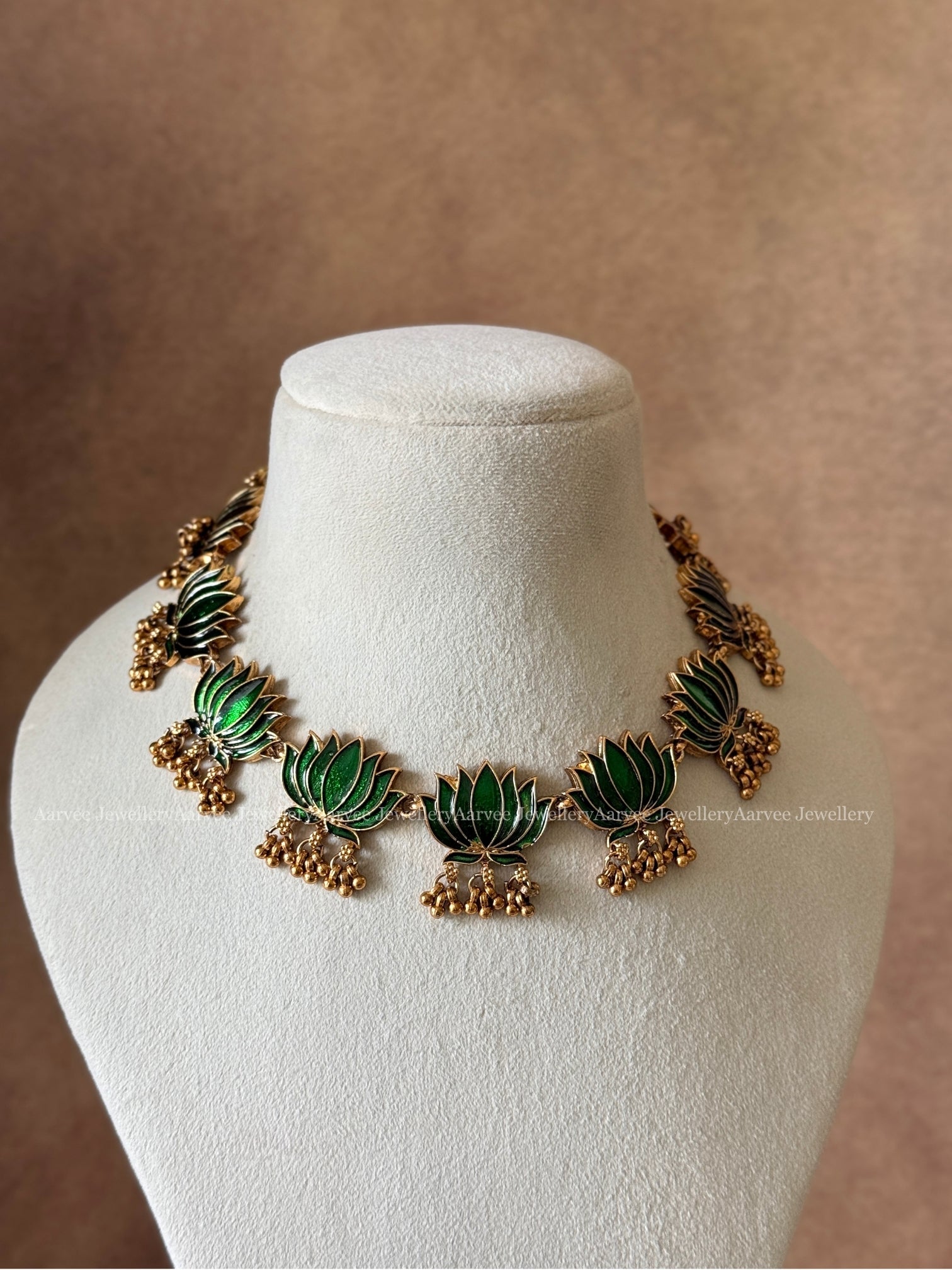LOTUS NECKLACE SET IN GREEN COLOR AND GOLD BEADS
