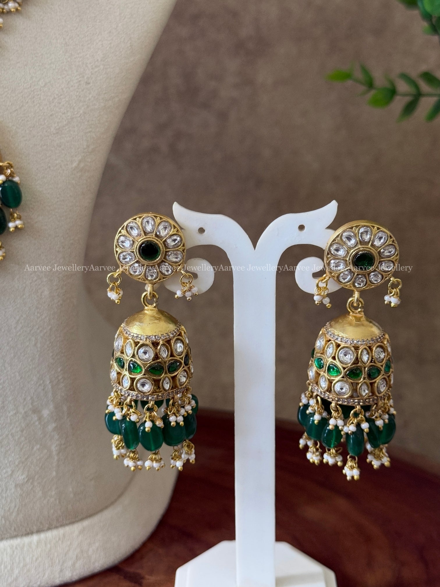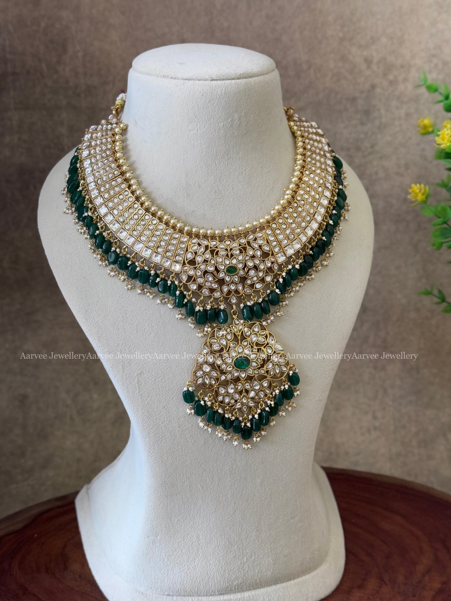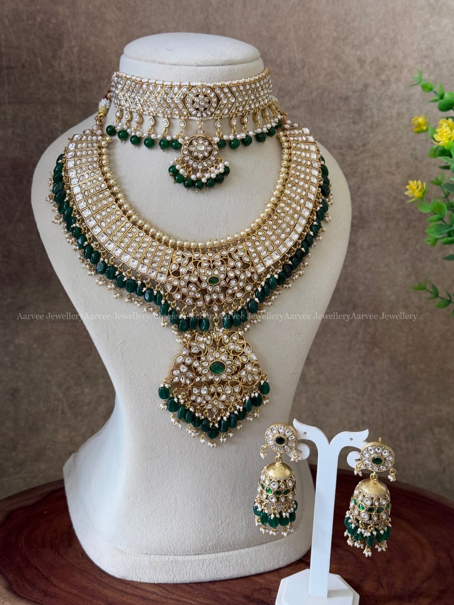 LUXE JADAU BRIDAL JEWELLERY — ADITI CHOKER, STATEMENT NECKLACE & JHUMKI COMBO SET IN WHITE STONES & DARK GREEN BEADS