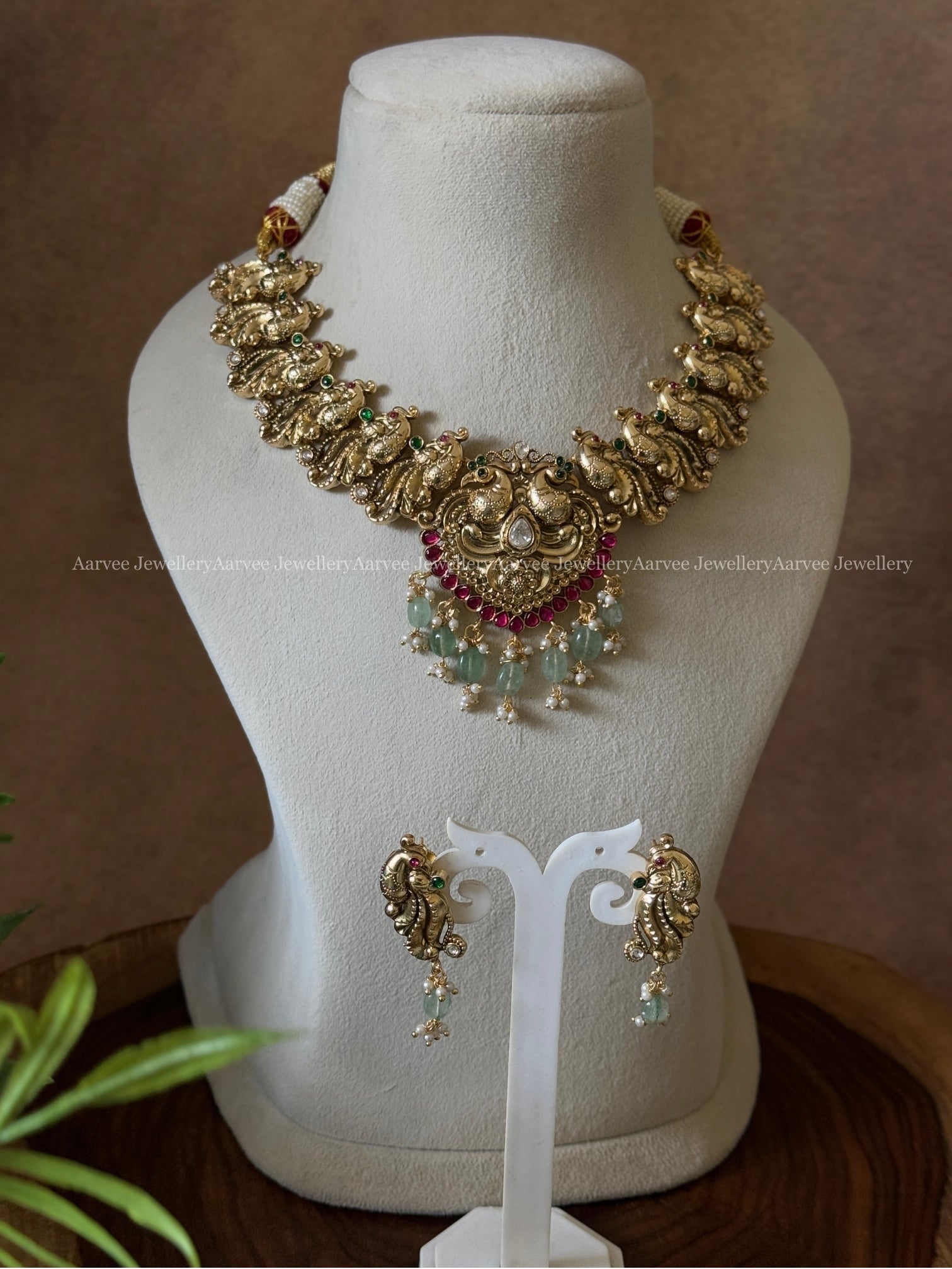 MILD ANTIQUE GOLD PEACOCK DESIGN NECKLACE SET WITH PASTEL BEADS