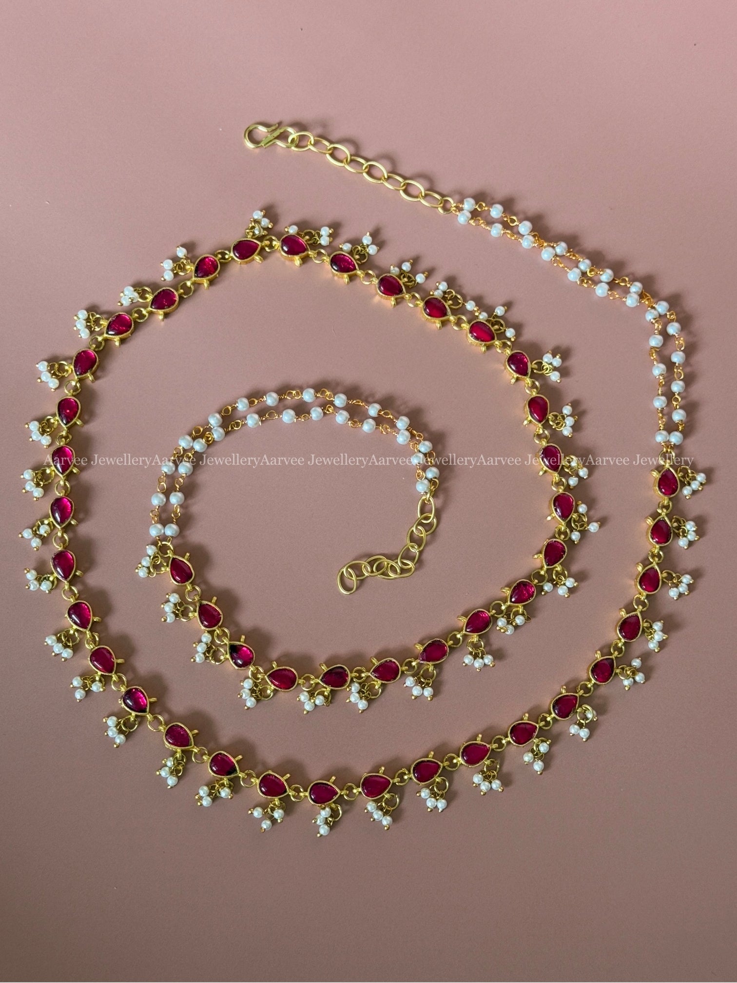 MINIMAL JADAU KUNDAN RUBY STONE WAIST CHAIN WITH PEARLS