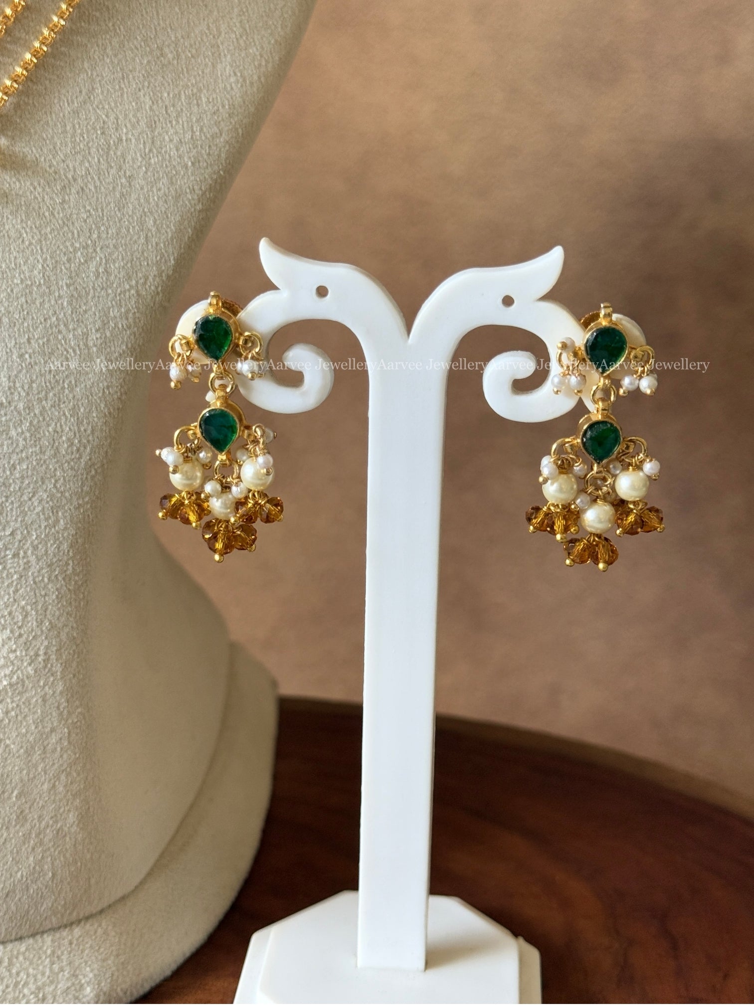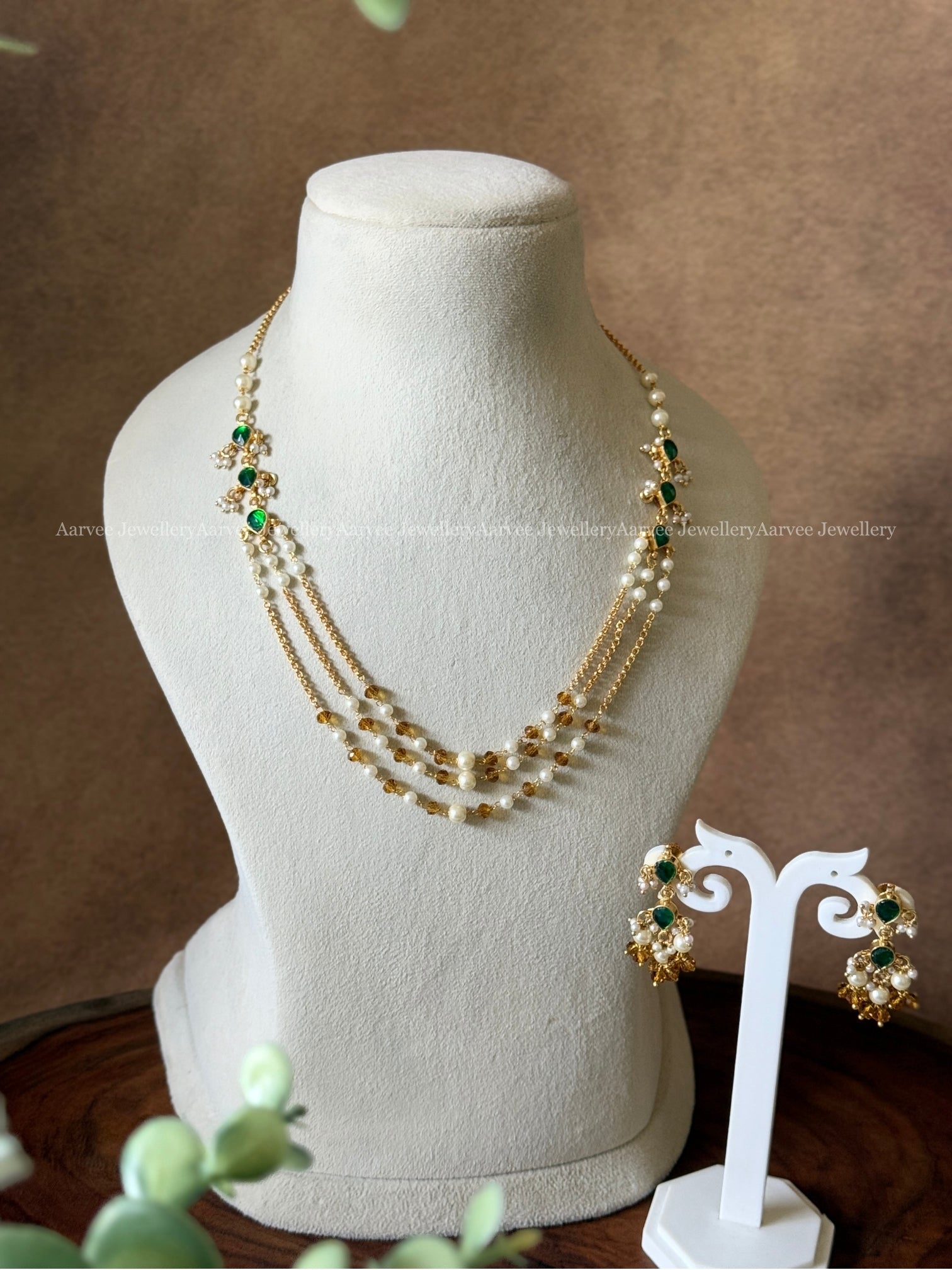 MINIMAL POLKI KUNDAN LAYERED CHAIN SET WITH GREEN STONE & MUSTARD BEADS