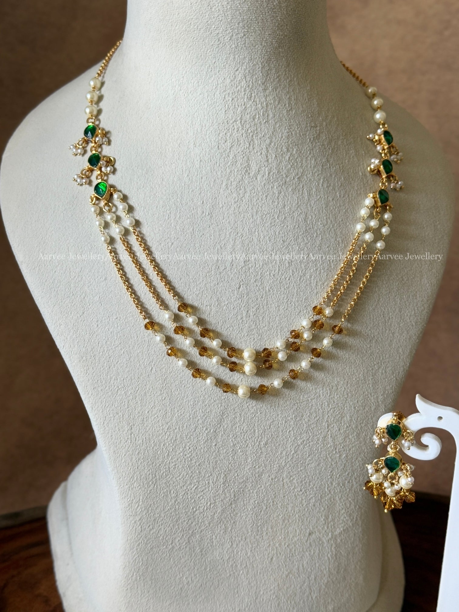 Delicate Polki Kundan Layered Necklace with Green Gemstones and Mustard Bead Accents