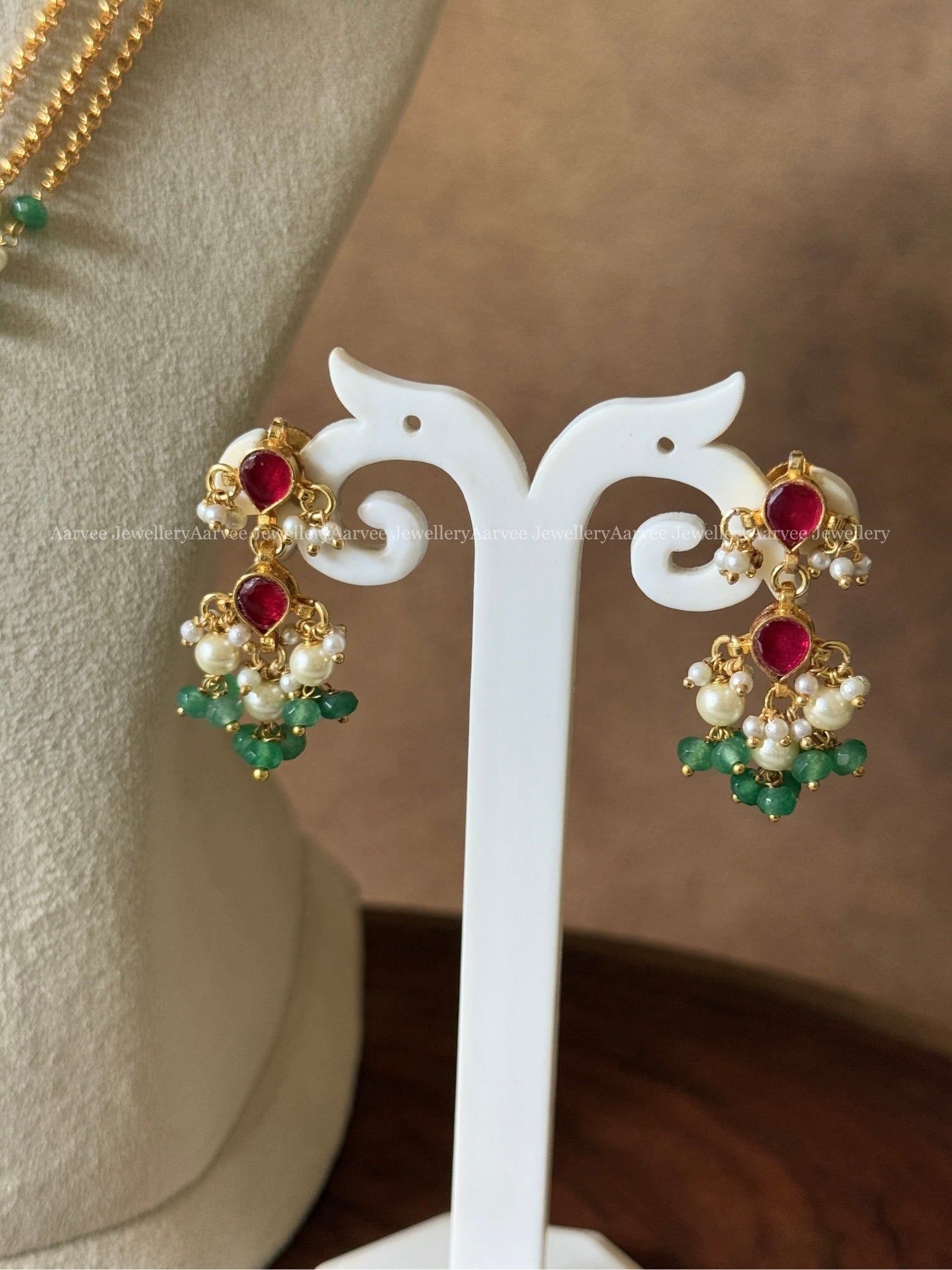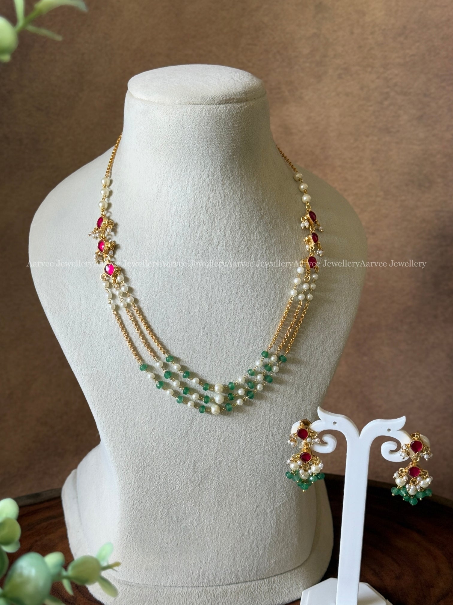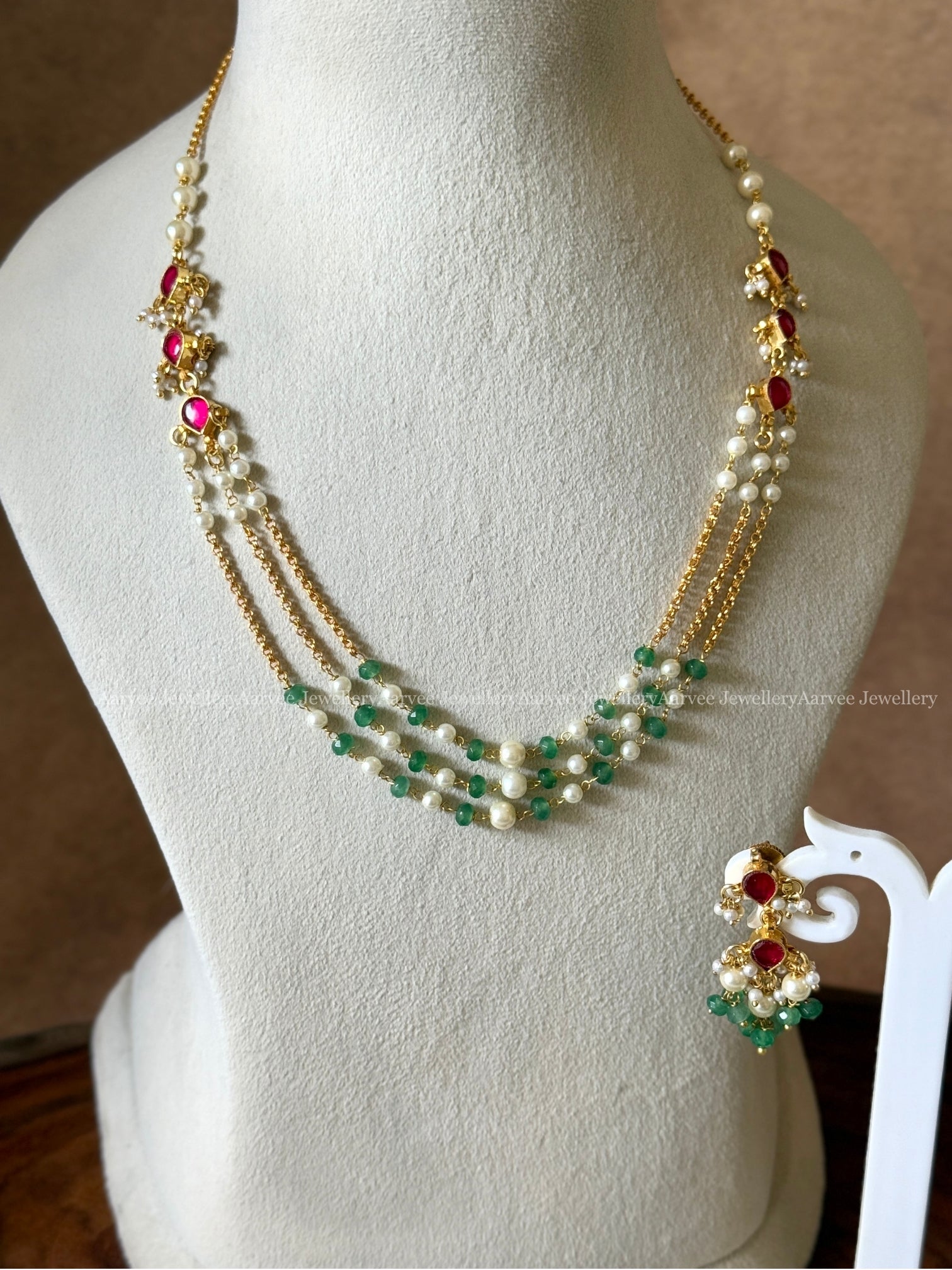 MINIMAL POLKI KUNDAN LAYERED CHAIN SET WITH RUBY STONE & PASTEL BEADS